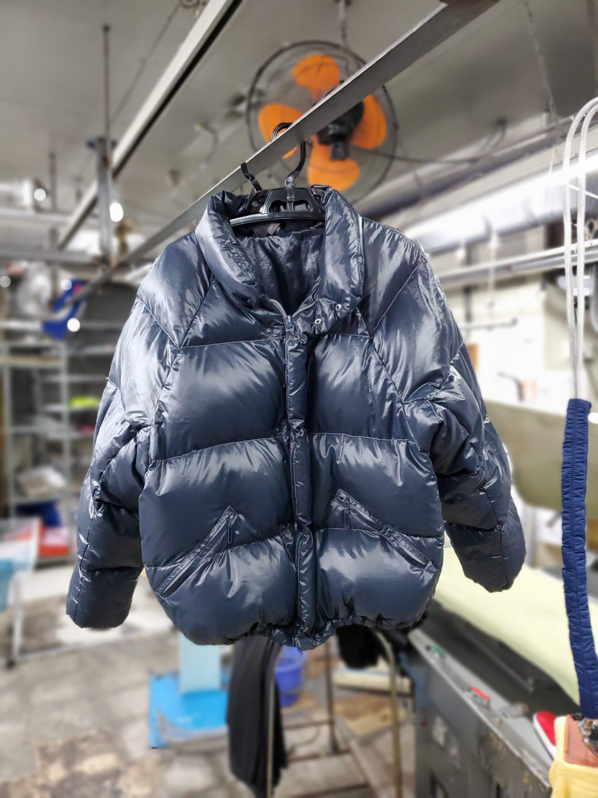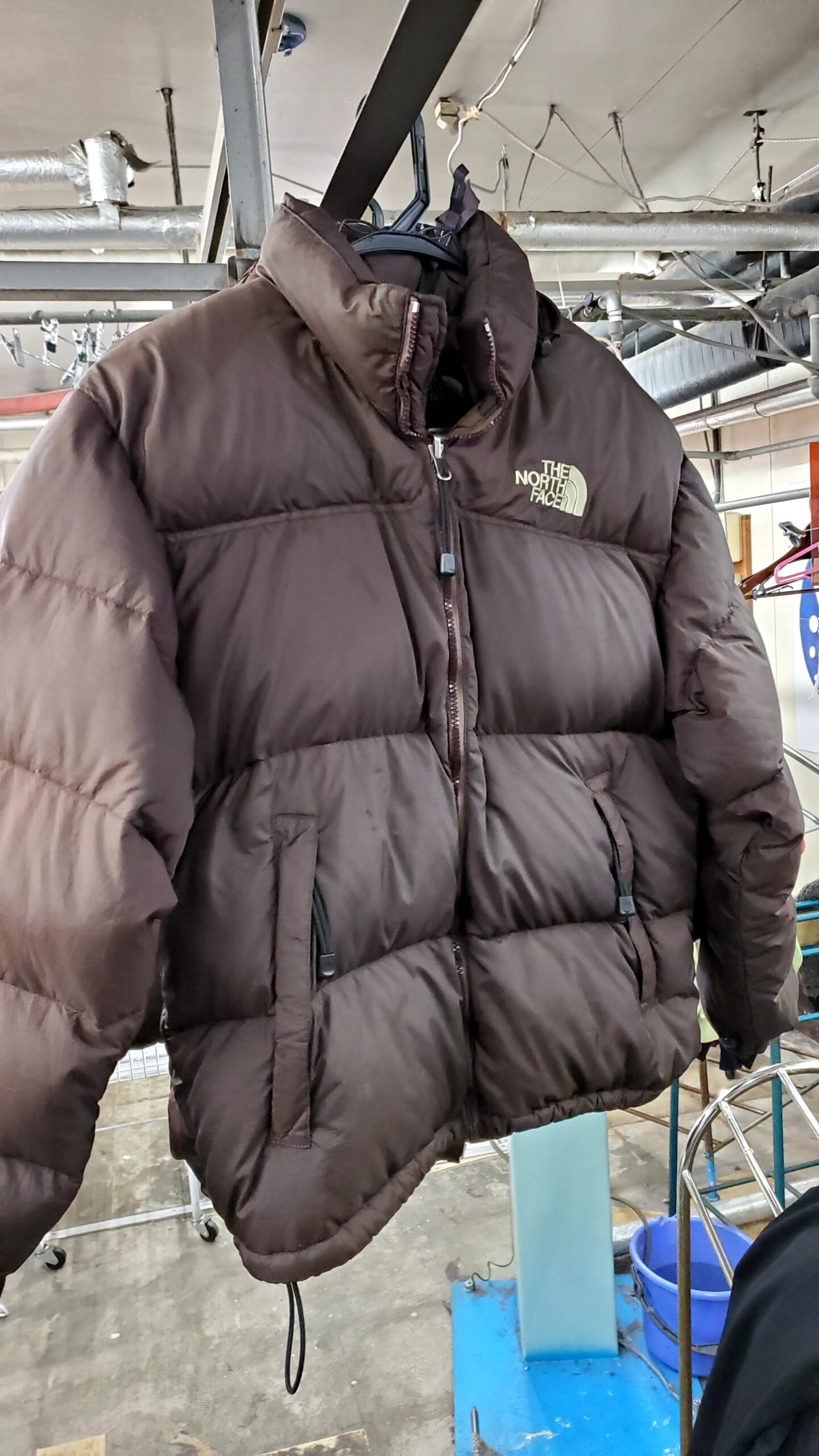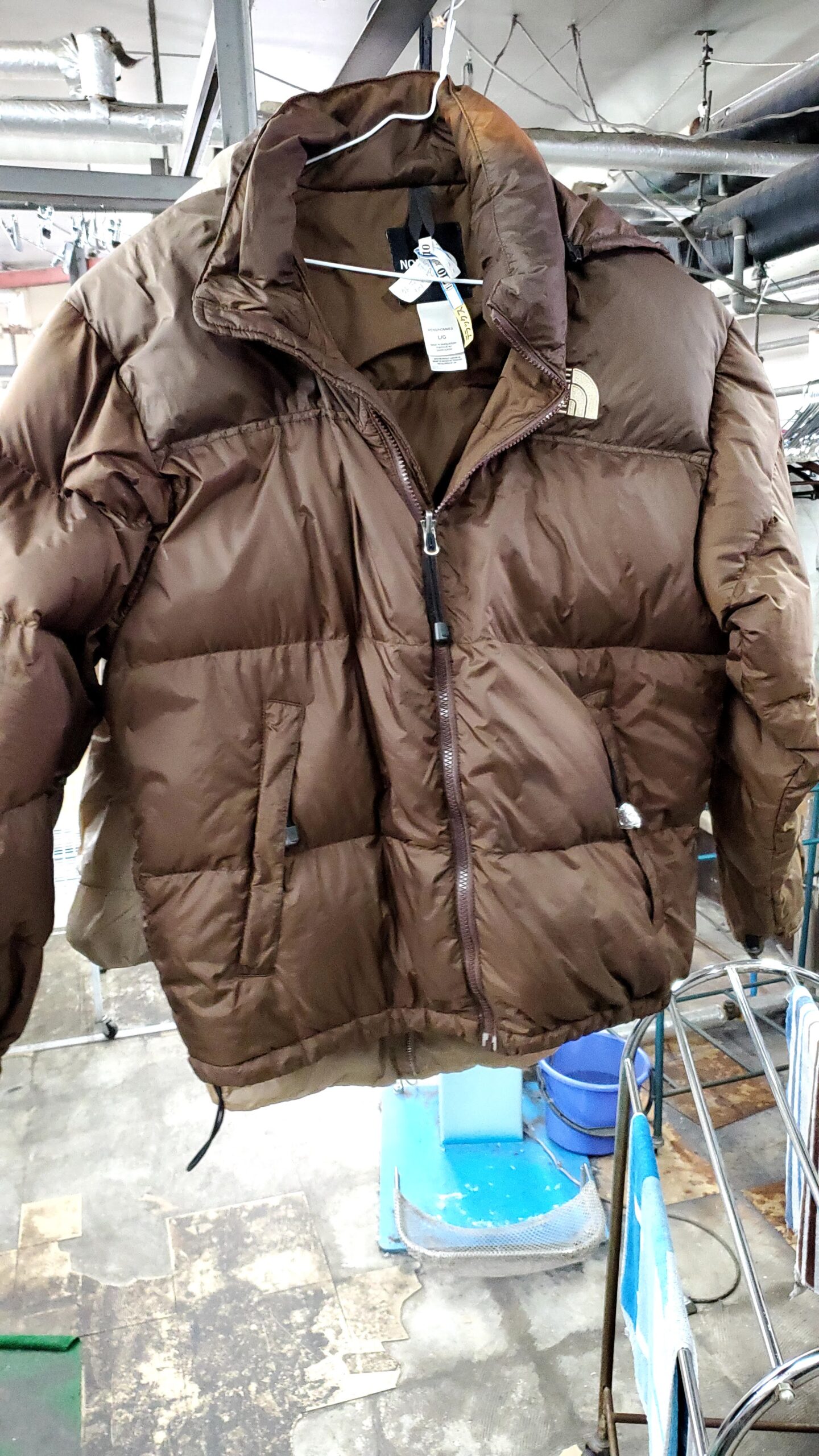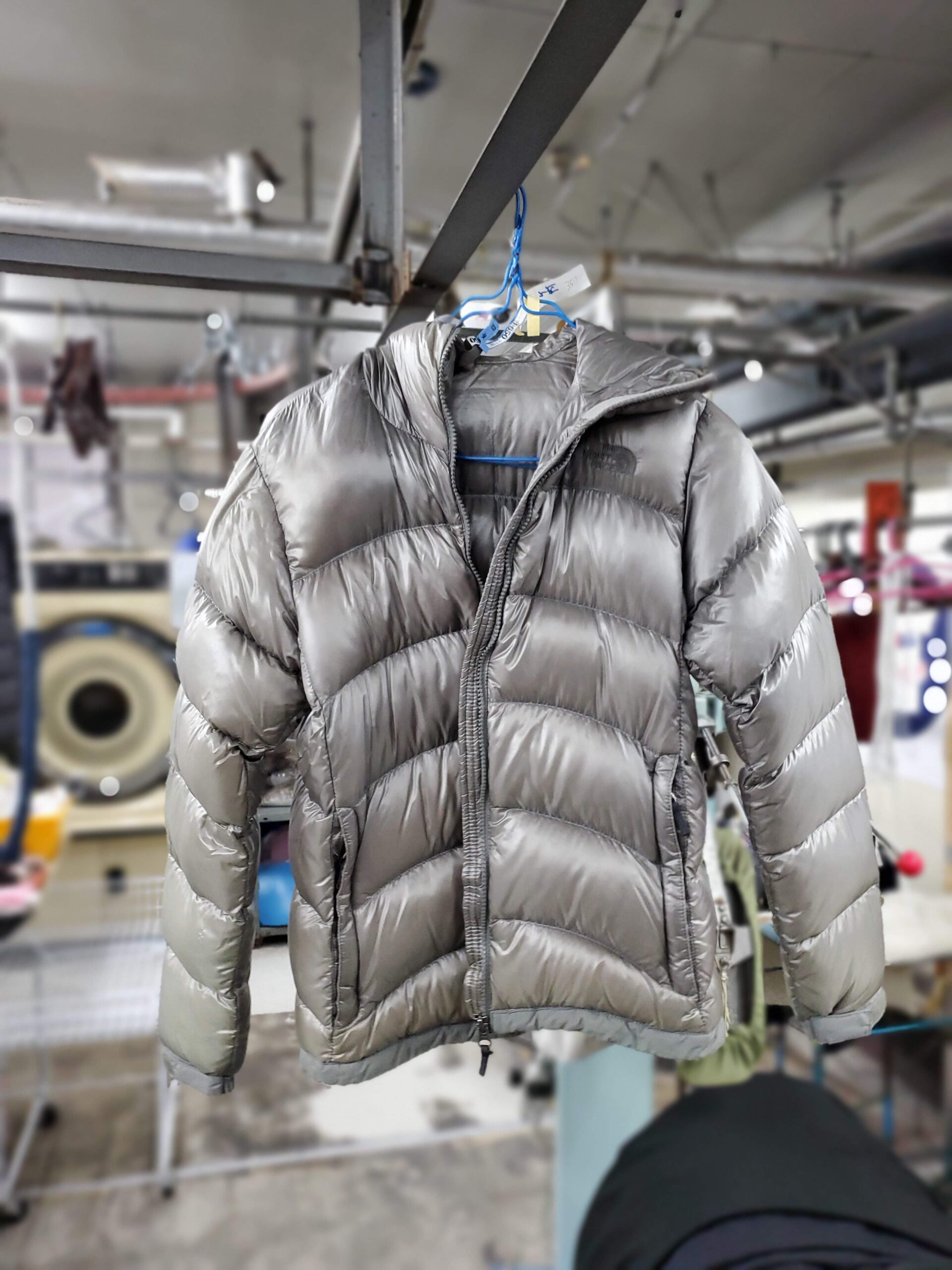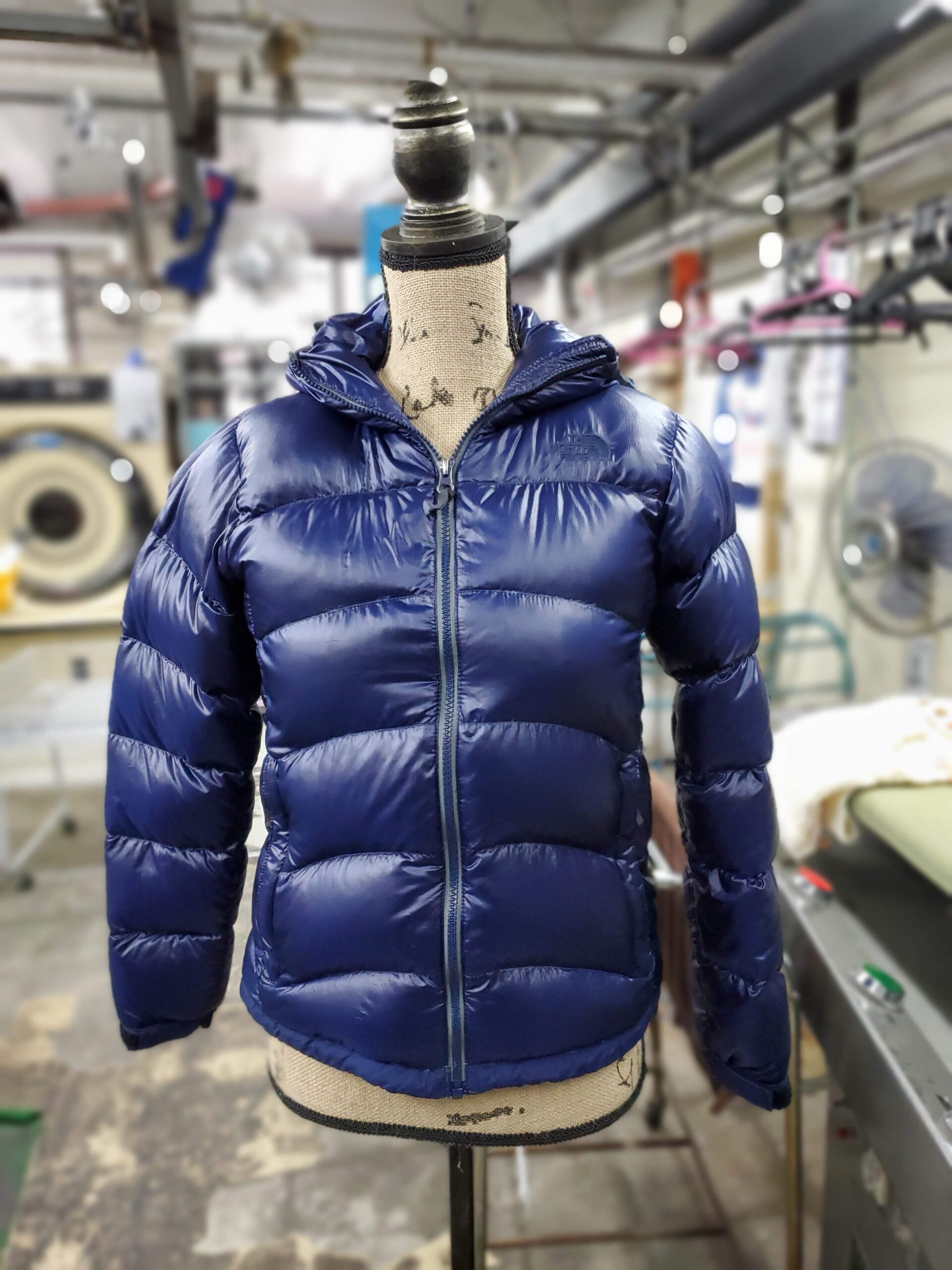 こちらはどこも色があせてないように見えますが、お客様のご希望で、ダウンの染め代えを行いました。実は、NORTHFACEのダウンって中に入っていす素材が羽毛だけで無く 光電子®ダウンといって(ダウン72%、レーヨン 20%、その他の羽毛 8%) と様々な成分が入っています。そのため、通常の染色の感覚で行うと間違うおそれがありました。いくら染色前に染色の注意で同意を得ていても、やはりキレイに染めたいのが職人の本望です。さて、どうしたものかと様子を見ながら、NORTHFACEのダウンを染色していきました。