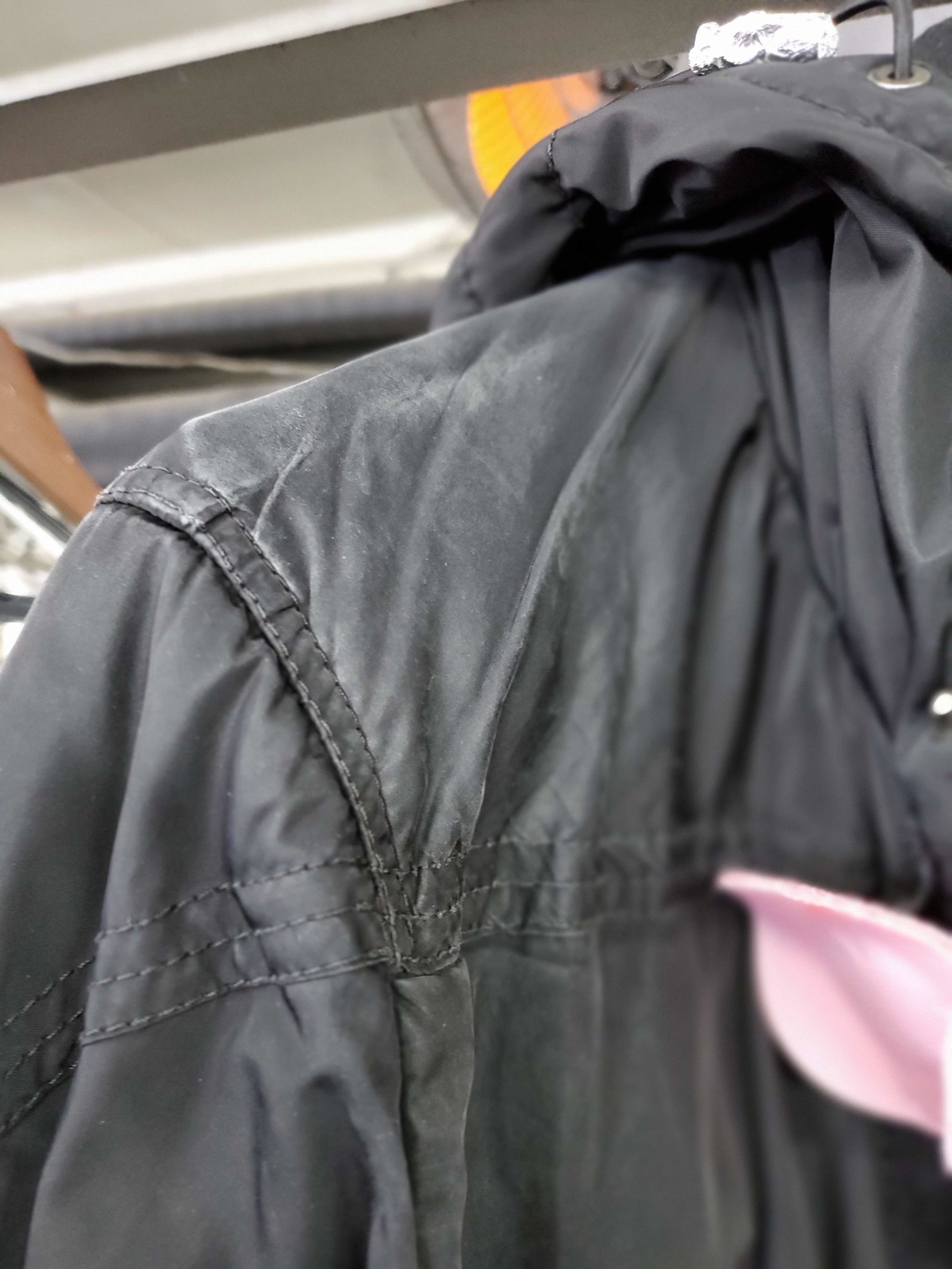 モンクレールのカーキ色はこのように色褪せがしやすいです。これは紫外線等によるもので、このようになると染色でしか修正が効きません。しかし、一度染色してしまえば、このようにまた着れるようになります。こちらも色美しく変わったと思います。ワッペンが付いていませんが、後から縫い直して付けます。