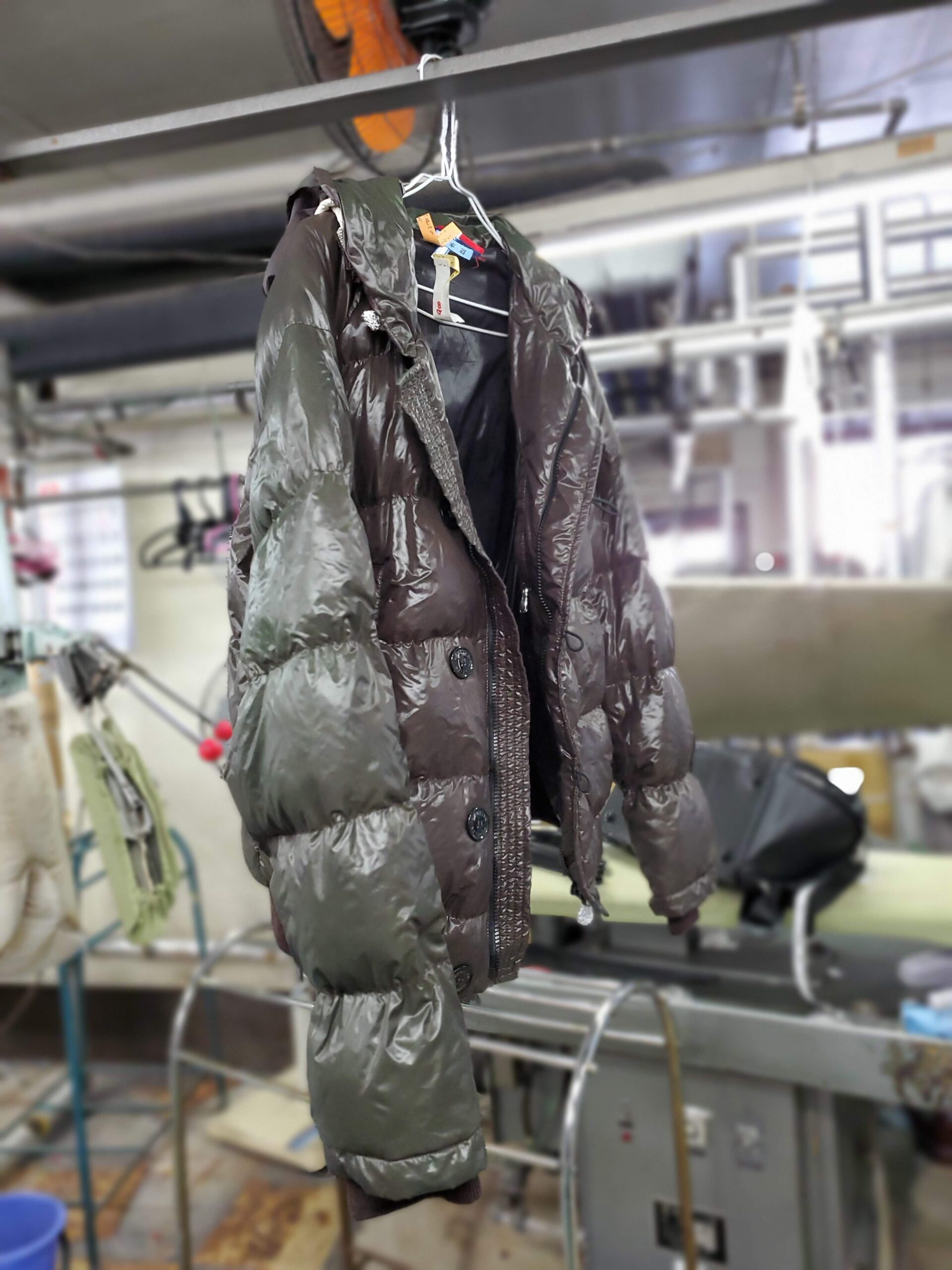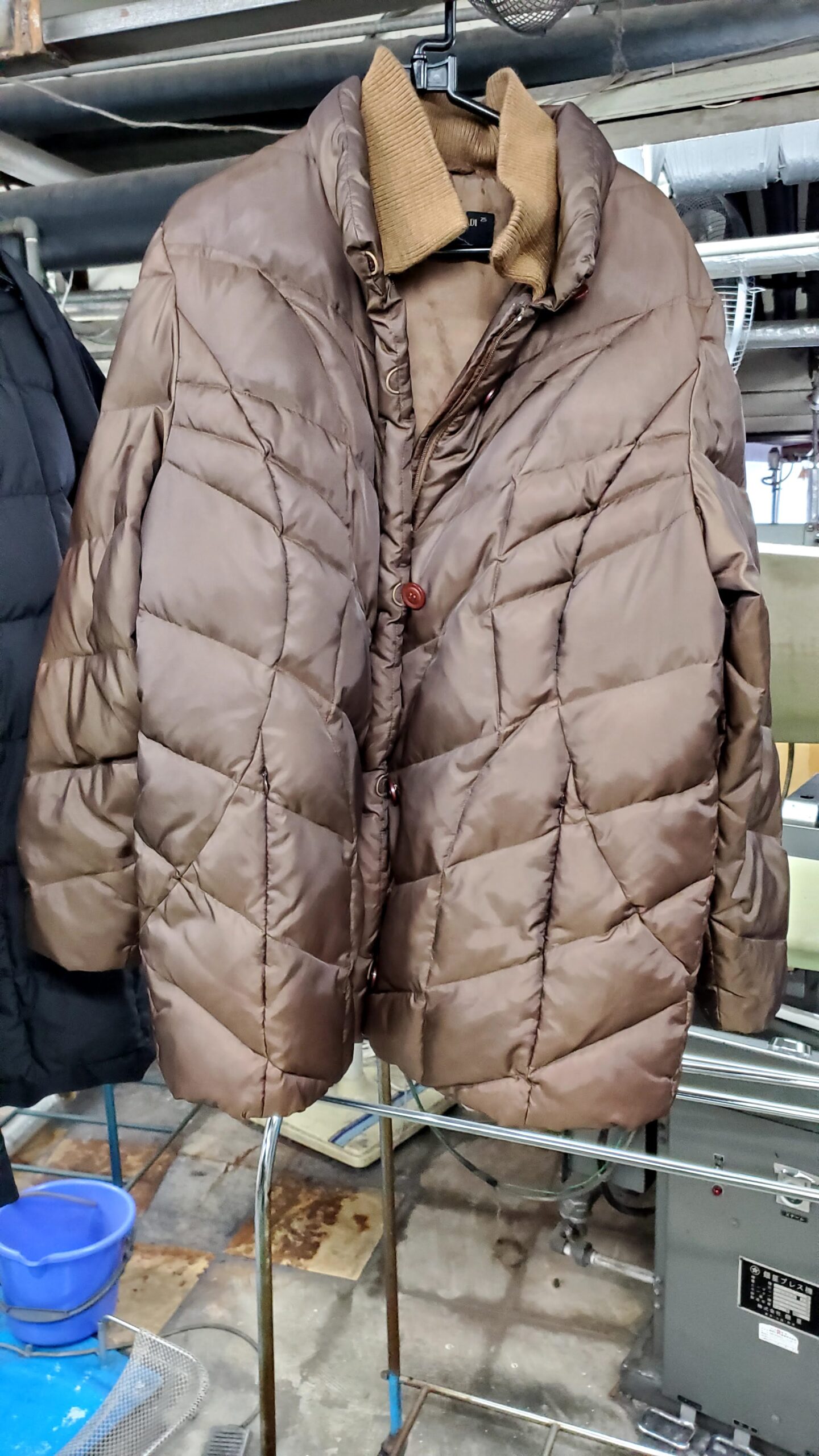 こちらは染色前のモンクレールのダウンです。両袖から所々、本来ならばモカ色だったのが、赤っぽくなっているのがおわかり頂けると思います。これをお客様の希望でチョコレートブラウンにしてほしいということでした。そして行ったのが下記になります。こちら染色する前はモンクレールダウンクリーニングを必ず行います。それもウェットクリーニングで徹底してよごれを落としてからです。