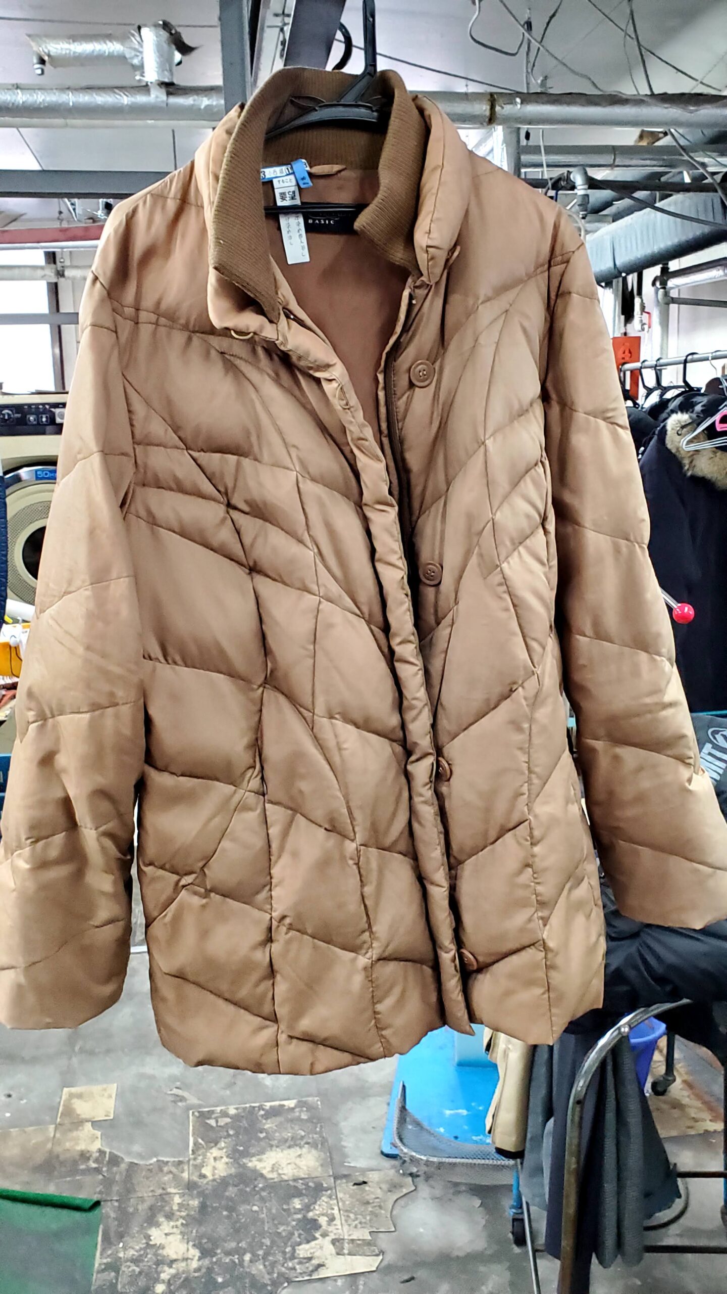 こちらの高級ダウンは元々グレーっぽい色味でしたが、写真で見るとおわかりのとおり、全体的に赤茶けている部分が出てきてしまい、これを直してほしいというご依頼でした。そのため、当社のおすすめするダークブロンでの染め替えとなりました。その後は以下になります。