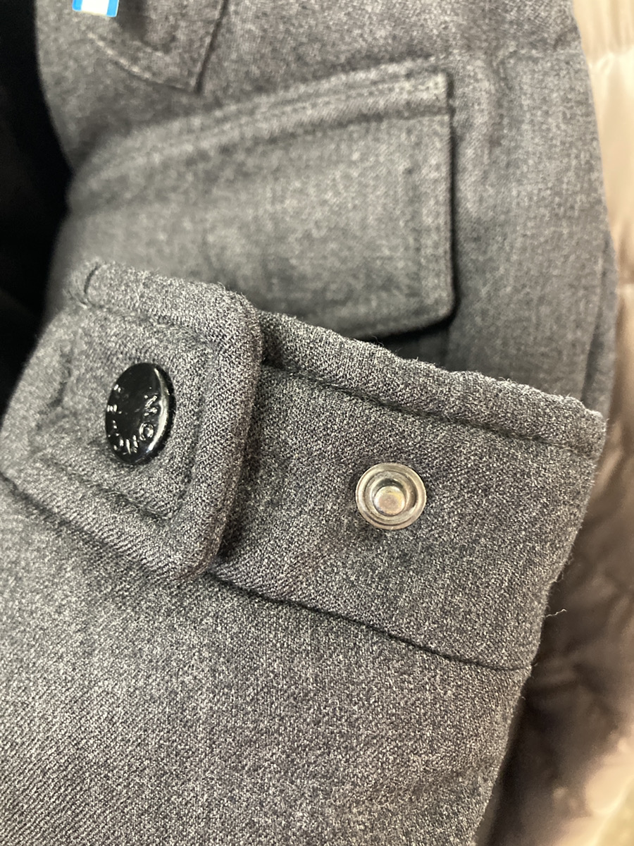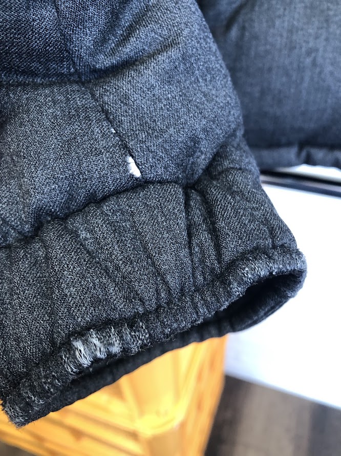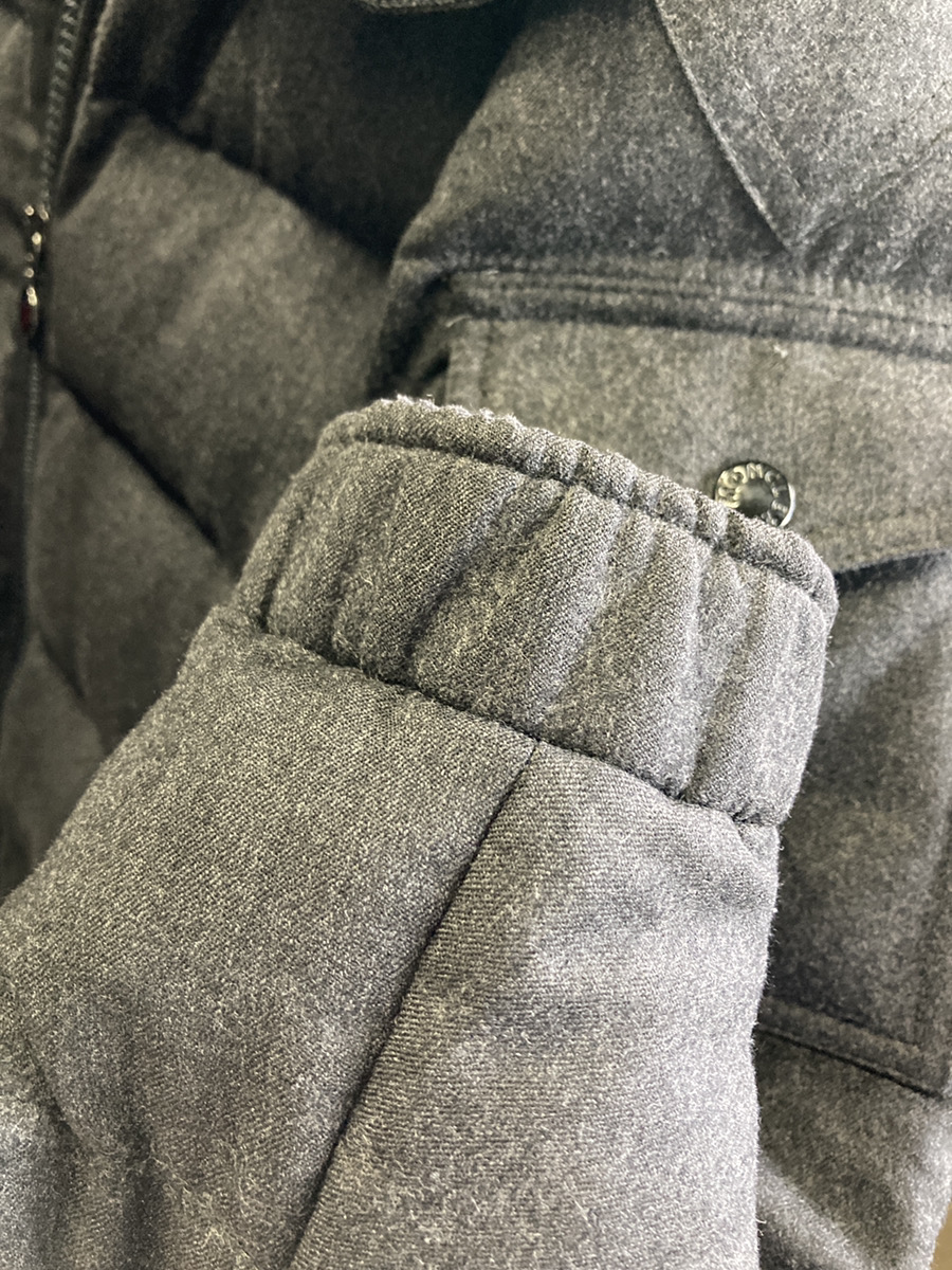 今回お預かりしましたダウンは、MONCLER(モンクレール)のMONTGENEVRE(モンジュネーブル)です。ダウンと聞くとナイロン製のダウンを思い浮かべる方が多いのではないでしょうか。実際、PROSHOP HIRAISHIYA(プロショップひらいしや)でお預かりするMONCLER(モンクレール)ダウンの多くがナイロン製です。しかし、その質感やシルエットからウールダウンを着用される方も増えてきています。MONCLER(モンクレール)のウールダウンといえばこちら、MONTGENEVRE(モンジュネーブル)です。スマートなシルエットと都会的な落ち着いたデザインは幅広い年齢の方から愛されています。一般的なモンクレールのナイロンのツヤ感とは打って変わってマットな柔らかい印象を持たせてくれるウールは冬にぴったりの暖かさを感じられるダウンになっています。販売されているカラーもブラックやグレー、ネイビーなど落ち着いた色味が多く、普段使いはもちろんオフィスコーディネートにも取り入れられるということで汎用性の高さもうれしいポイントですね。体にフィットするシルエットがよりスマートな雰囲気を演出してくれます。フードの取り外しが可能な仕様になっているのでシーンに合わせて楽しむことが出来ます。冬の衣類に使われる印象の強いウール。伸縮性と保温性に優れており、寒い時期にはぴったりの素材なのです。繊維同士の隙間に暖かい空気を蓄えつつ外の冷気を防ぐことが出来ます。また、ウールには、私たち人間の髪の表面を覆うキューティクルと似た「スケール(表皮)」というウロコ状の層が存在します。吸湿性のある内部組織「コルテックス(皮質)」が、湿気を溜め込み膨潤していくとスケール(表皮)は開いて放湿されます。そして「コルテックス」の水分が減少していくと、「スケール」は閉じられます。この働きによって、羊毛は快適な水分状態を保っています。そして驚いたことにこの働きは羊から羊毛が刈り取られ、ウール繊維としてセーターになっても失われることはありません。このことからウールは「生きている繊維」と呼ばれています。MONCLER(モンクレール)のMONTGENEVRE(モンジュネーブル)は、優れたダウンとウールの特性が組み合わされて作り出されているんですね。今回はこのMONTGENEVRE(モンジュネーブル)の修理について解説します。