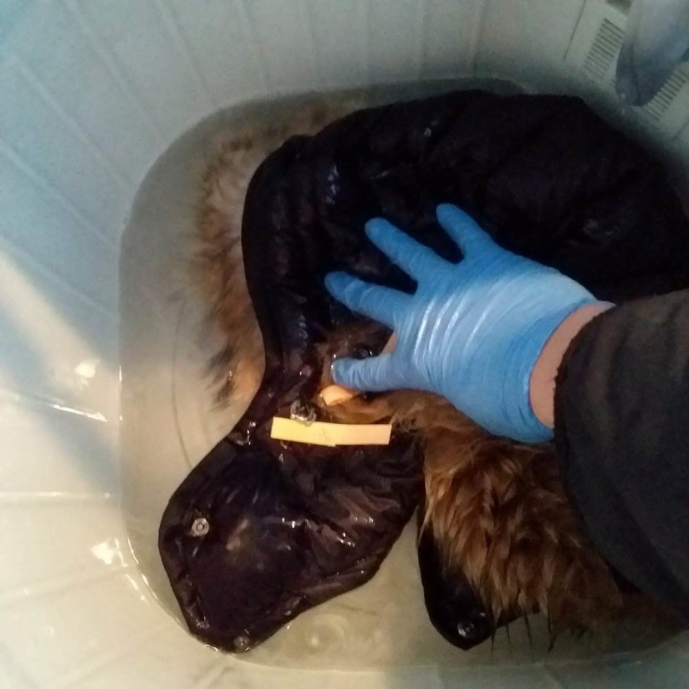 ファー付のクリーニング依頼です。一見汚れがないように見えますが、結構ありました。