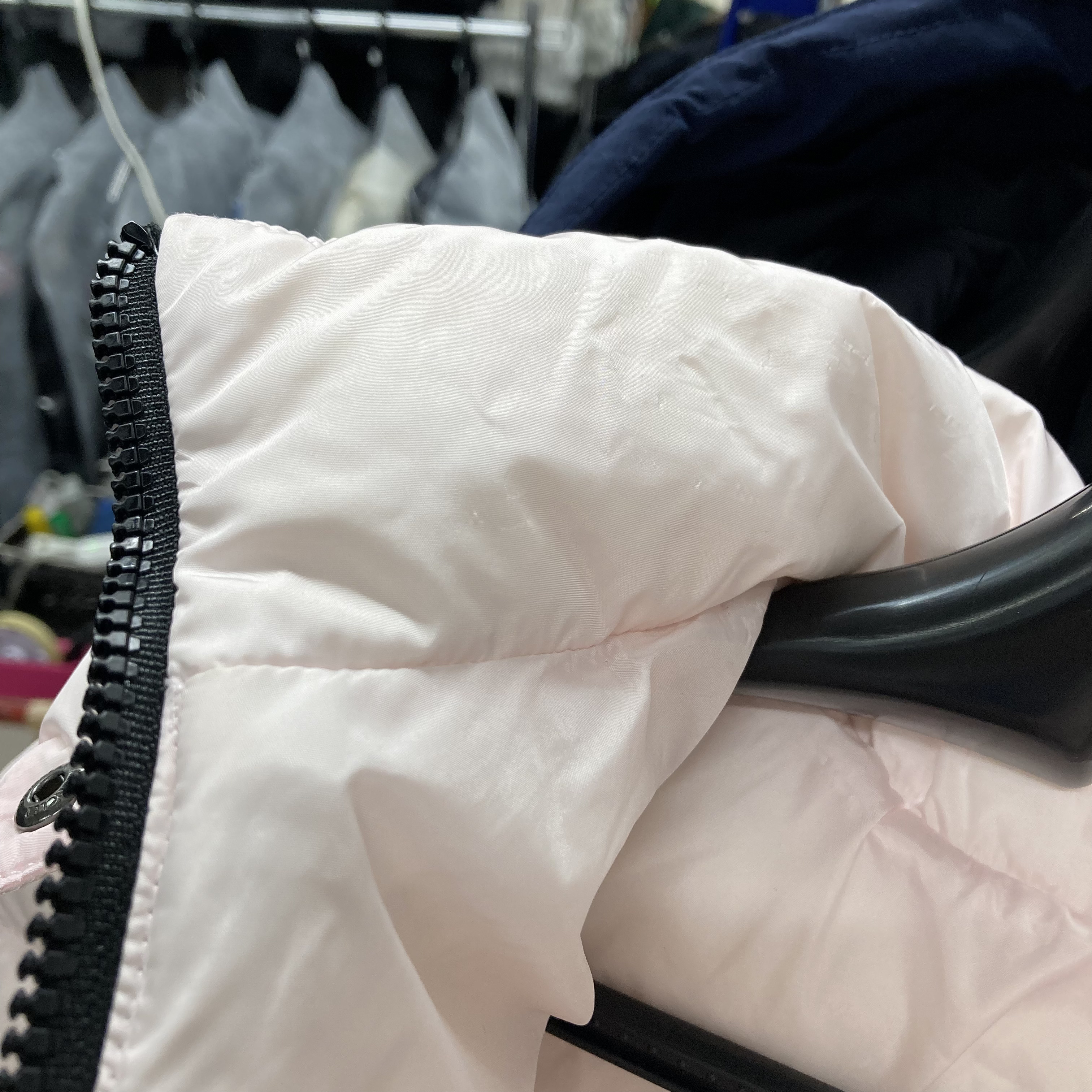 こちらの写真が仕上がり最終工程の検品を控えたモンクレールダウンです。ダウンクリーニングする前に比べると全体的に本来の色であるベビーピンクへワントーン明るい仕上がりになりました。モンクレールダウンクリーニングをすることにより着用する過程で羽毛がねてしまいボリュームダウンして見えていた印象がダウンクリーニングをすることによりふっくらとボリュームが復活しました。このボリュームを復活させるにはクリーニング店ならではの業務用の大きなドラム式乾燥機が活躍します。ウェットクリーニングで水洗いをした後、生地を傷めないよう一度自然乾燥で生地を落ち着かせドラム式乾燥機に入れます。乾燥機を回す際に、特別なボールを一緒に入れ空気を叩き入れながら乾燥させます。すると羽毛が立ち上がりふっくらとした仕上がります。乾燥させたあとは高温の蒸気がでるアイロンで熟練のスタッフが手作業でシワを伸ばし完成です。買った当初のようなハリが戻り今年の冬も暖かくお過ごしいただけるのではないでしょうか。ぜひ、気になった方はお気軽に公式サイトまたはお電話でお問い合わせください。ご依頼スタッフ一同心よりお待ちしております。