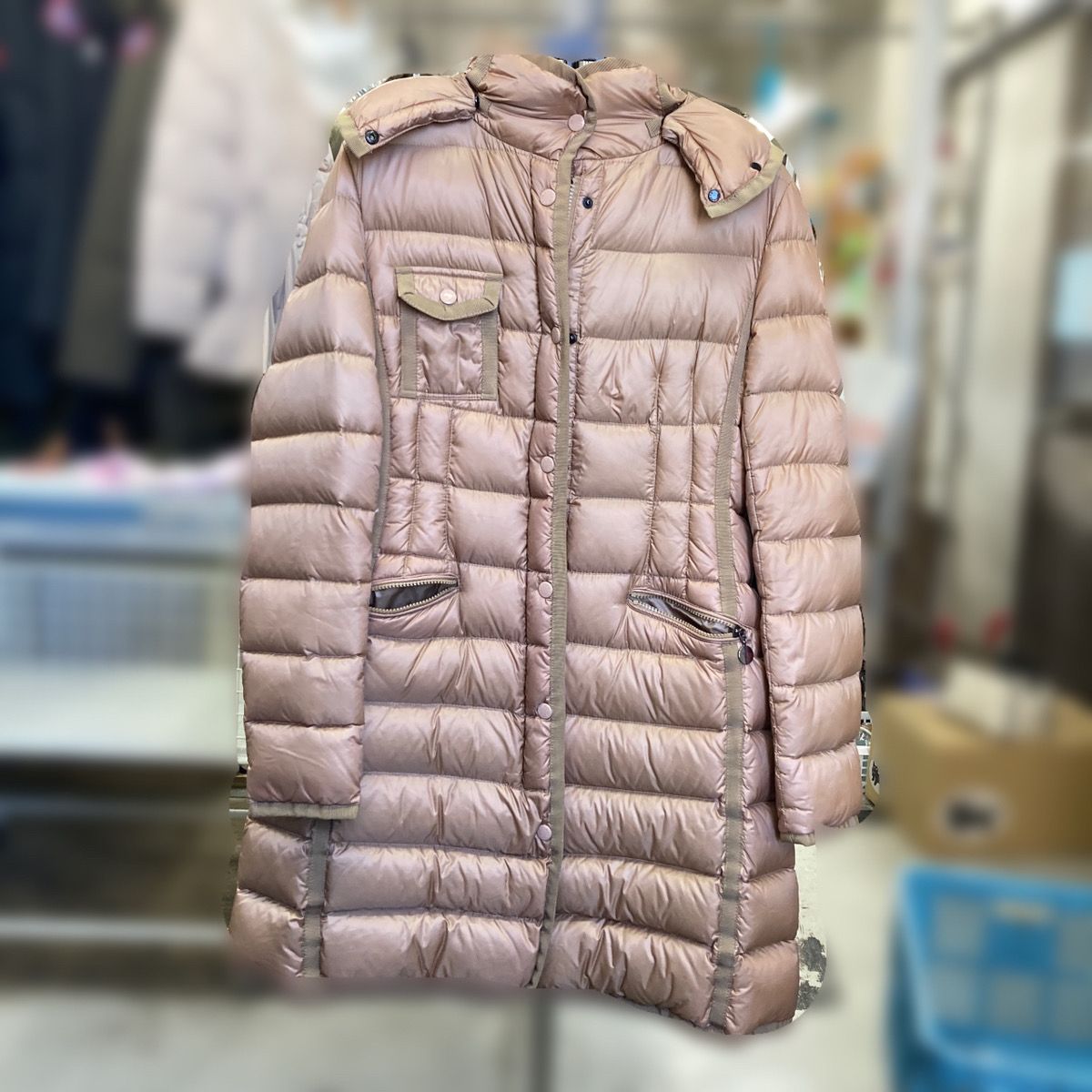 こちらがモンクレールのフロントスナップボタンの塗装剥がれを修理した後のお写真です。今回はフロント部分とポケット部分合わせて10個の塗装修理を行ないました。同じピンクベージュのお色は既製品にはなくお色を作るところから行ないました。違和感なく仕上げることができました。お色によっては修理ができない場合や、スナップボタン自体に不備がある場合には汎用品へお取り換え修理も行なうことが可能です。お気軽にご相談くださいね。修理後はモンクレールのクリーニング工程に入ってまいります。PROSHOP HIRAISHIYAにご依頼されるほとんどの方は”ウェットクリーニング”を目的にご依頼されるかと思います。一般的なクリーニング店ではリスクを少なくするため水よりも軽い溶剤で洗いあげるドライクリーニングのみで仕上げる場合も少なくありません。もちろんドライクリーニングにも良いところはたくさんあり、弊社でも使い分けて使用しています。しかし、モンクレールダウンの中に詰められたダウン(羽根)をしっかり洗いあげたいとなるとウェットクリーニングがおすすめです。水を使ってしっかりとよごれを落とすことができるため清潔感が全く違う仕上がりとなります。