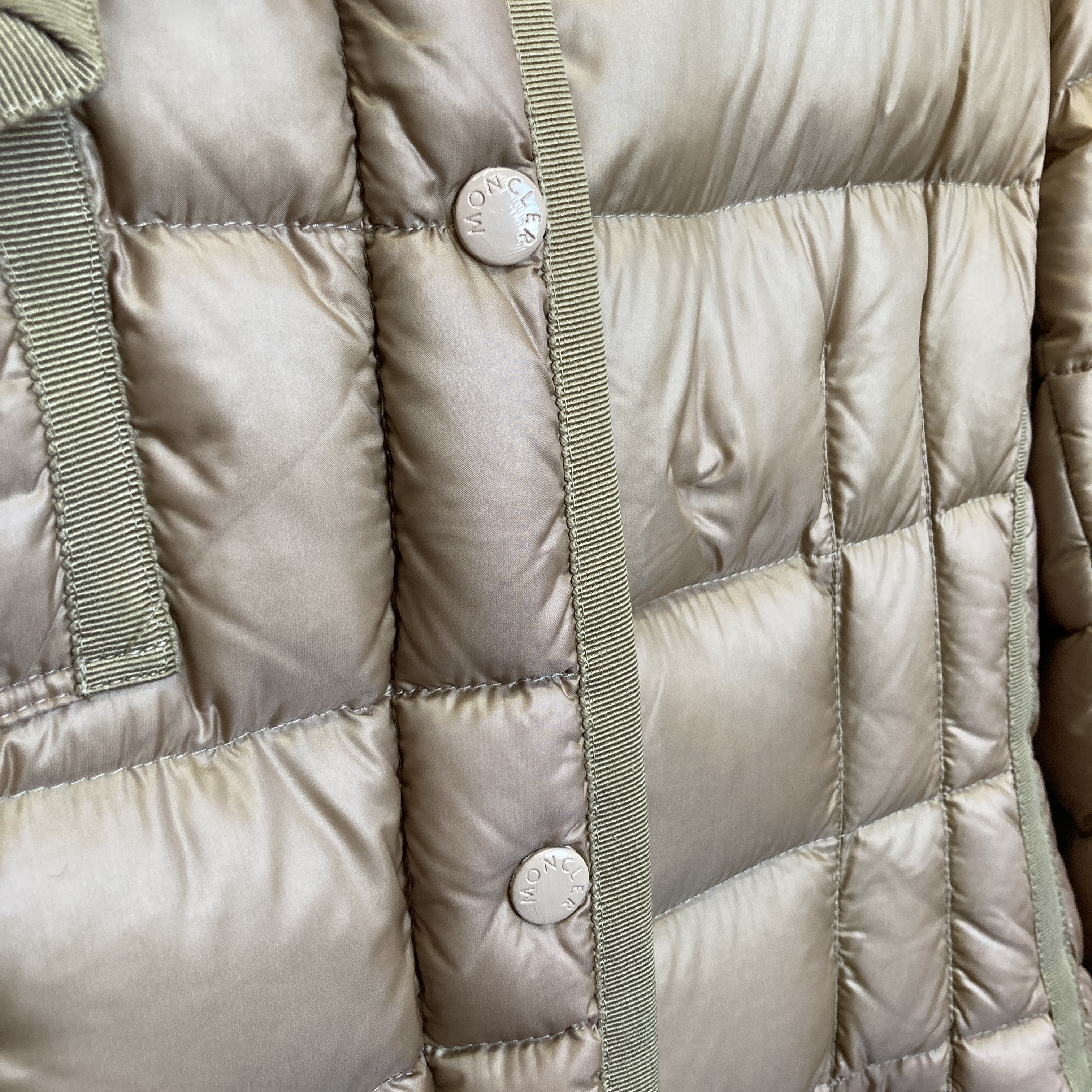 早速、お預かりしたモンクレールのダウンコートを見ていきたいと思います。ピンクベージュの色味が女性らしさと上品なイメージを演出してくれているこちらのモンクレールのダウンコートは ”HERMINE (エルミンヌ)”というモンクレールのダウンの中でも女性から人気を集めている定番のモデルとなります。Aラインが美しくスタイルアップして見せてくれるのも嬉しいポイントのひとつ。デザイン性だけではなく、モンクレールのダウンに詰められているダウン(羽根)はフランスの規格協会が最高品質のダウンであることを認めるキャトルフロコンマークを取得してることは有名ですね。 キャトルフロコンとは4つの羽という意味。 この認定をもらうには、厳しい基準をクリアすることが必要です。タウンユースはもちろんのことアウトドアでも活躍するほどの実用性の高いハイスペックなダウンと言って良いでしょう。今回のご依頼内容は通常のモンクレールクリーニングに合わせて「超撥水ウルトラ加工3α」「特殊2Wクリーニング」「ボタン塗装の修理」をご依頼いただきました。モンクレールのウェットクリーニングはPROSHOP HIRAISHIYAの一番人気のメニューです。