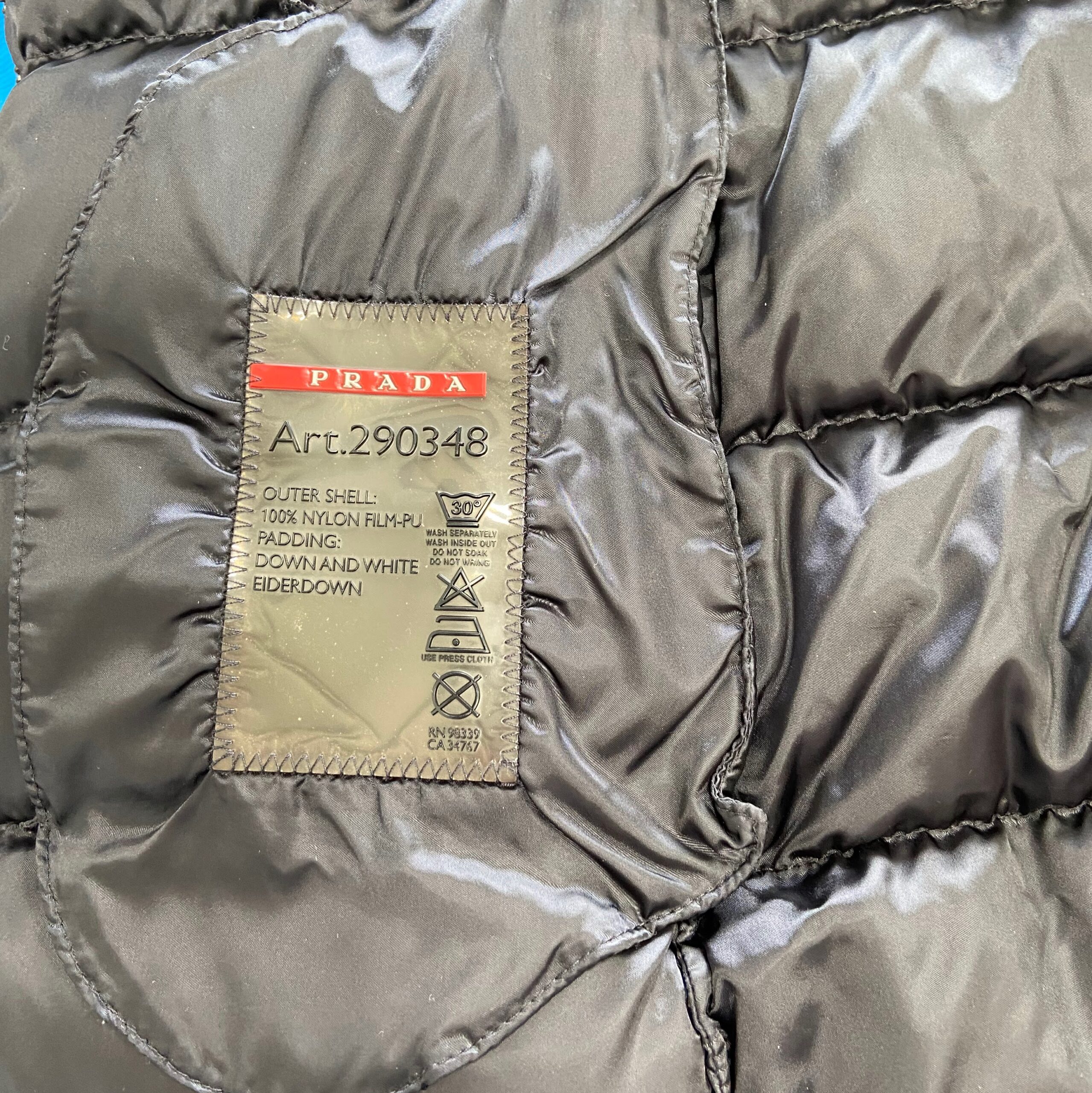 こちらのプラダダウンジャケットの特徴はもう1箇所あり、それがこれです。ダウンの素材の上に皮の素材が乗ってあり、さらにその上にプラダのマークがあります。これもプラダ製品の特徴です。プラダダウンジャケットのほとんどはこのように皮の素材の上にプラダマークが付いていることが多いです。このように通常ではない素材の組み合わせがあるのがこのダウンジャケットの特徴で、とてもこだわり抜いておりますね。当社ではこの皮の部分があるため、通常のクリーニングとは違うやり方で行なっております。革は洗うと表面の黒い部分が禿げてくるため、洗うのには慎重にしないといけません。また、上のファスナー部分があるため構造上複雑になっています。そういった兼ね合いもあり、あまりこの部分はプラダクリーニングする上で強くすることはしないほうがいい思います。皮の部分があまりにもひどいものは過去に見たことがなく、こちらもキレイな状態にありました。おそらくプラダブランドということで、最高品質の皮を使っているのだと思います。もし万が一、皮部分が禿げてしまって気になる場合は当社の革部門で修正が可能なので、ごそうだん下さい。何度もになりますが、特に何もなかったのがこちらのダウンになります。