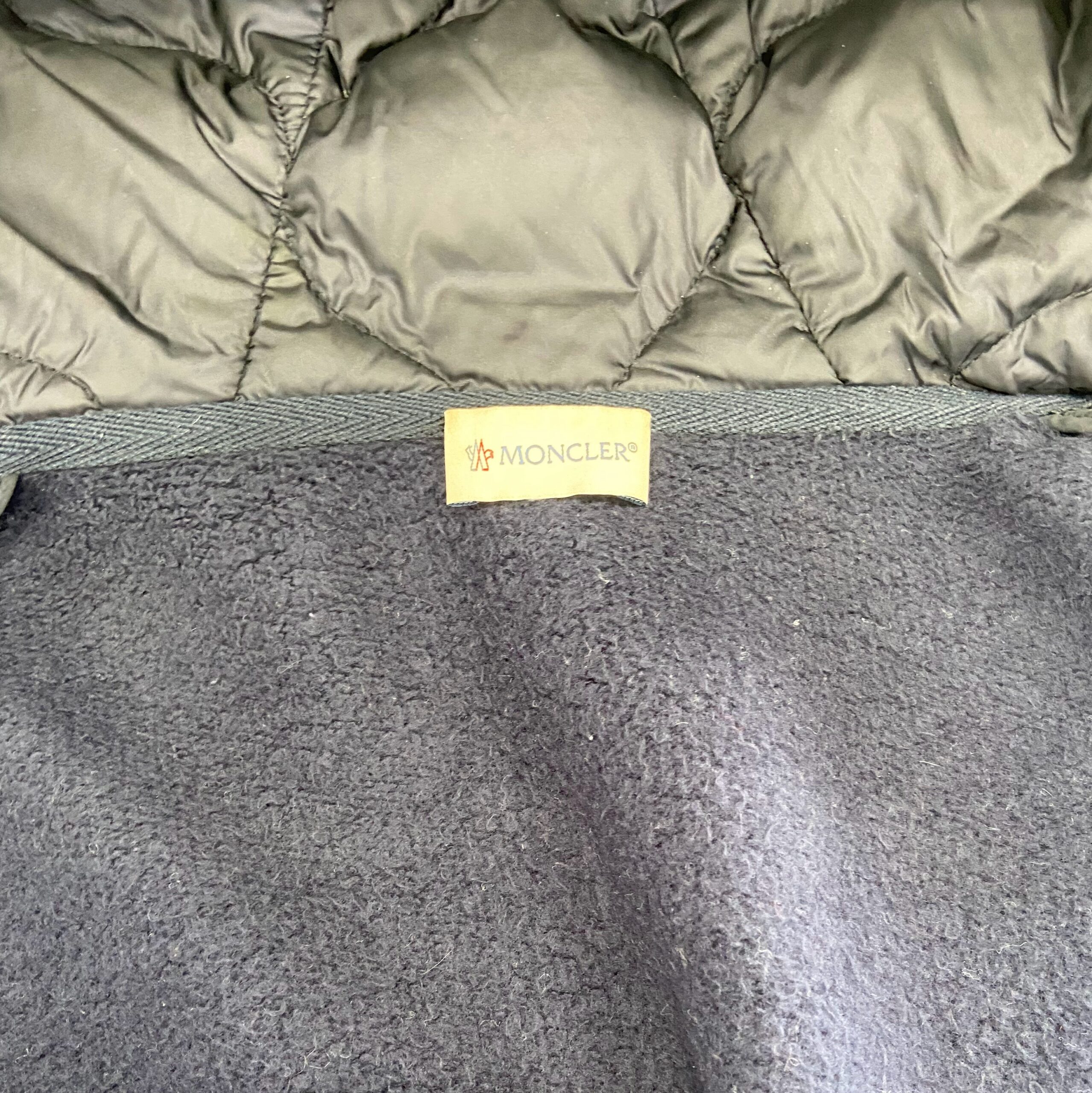 こちらは襟の部分をズームアップした写真です。中の生地はダウン素材ではなく、特殊な素材なっていました。こちらはボンディング加工といって、表はダウン素材ですが、中の生地は肌触りの良い素材を使っておりました。このボンディング加工というのはとても良い面と悪い面の二つを持っております。これはモンクレールだけではなくて世の中には非常に多くの加工が施されたものがあります。良いところは素材のいいとこどりしてどんなふうにも加工ができるという面があります。悪い面で言うと、いつかはボンディングが剥がれると言うことが起こります。理由は素材同士がボンドを使ってねばしてあるので、いつかはそのボンドが剥がれてしまうと言うことです。そうすると、中に空洞ができてしまいます。シームレスダウンもその類です。そのため、寿命をよく考慮して行うと購入を検討されるといいと思います。話は戻り、この襟の部分はこの素材の中で最も汚れる部分にあるため、念入りにクリーニングを行います。プロショップひらいしやの良いところは落ちてなくても何度も洗い直しすると言うことです。通常のクリーニング店さんですと滅多なことがない限りしないところが多いと思います。