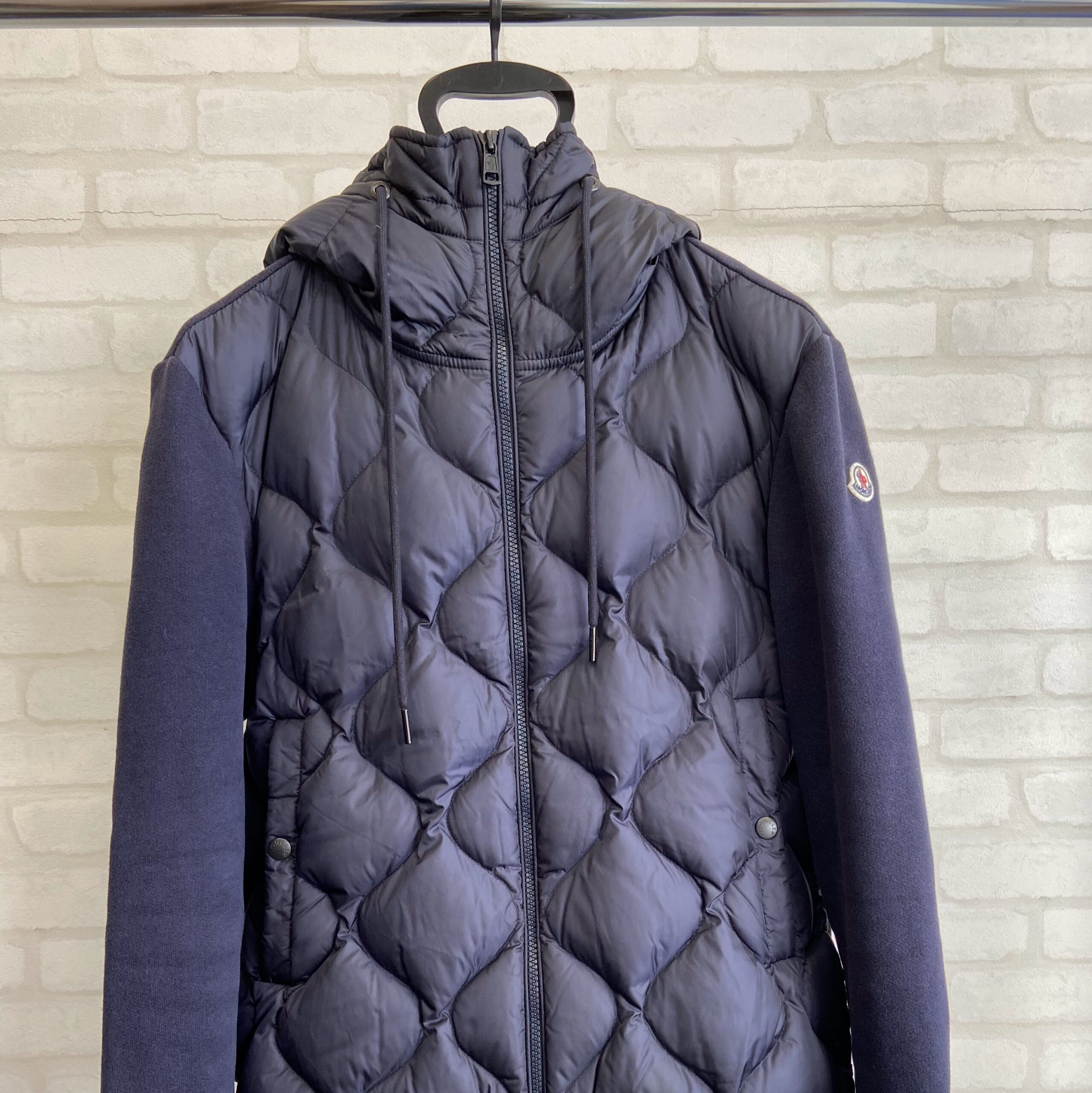 こちらはモンクレールのダウンジャケットになります。お色はネイビーとなります。モンクレールは元々はフランスで生まれたものです。初めはダウンジャケットではなく登山家や労働者のためのシュラフやテントを作成していました。そこから今のダウンジャケットにたどり着くというわけでとても大変な変化があったのですが、元は登山家がK2という高い山に登るときに使っていたものを着用していて位ですから、品質は超一流というわけです。現在のモンクレールはダウンジャケットを中心とした会社となっておりますが、それ以外に帽子、靴、サングラスと様々なものを作っており、どちらかというと高級ブランドの類になると思われます。街を歩くと見ない日はないくらい日本ではとても人気のブランドですね。こちらの製品はモンクレールの中でも複数の素材を重ねたものです。本体はナイロンを使用したダウン、袖は綿を使用したものです。このように複数の素材を重ねたものはそれぞれに特徴を活かした作りになっており、とても美しいです。モンクレールクリーニングを行う立場としては複雑な作りで大変なものになりますが、やりがいはあります。こういったものを綺麗にすることが当社を選んでいただいている理由と思います。こう言った本体と袖が違う素材はそれぞれの寿命が違うため、異なる変化を起こしていきます。そのため、なるべく同じ変化になるように気をつけてモンクレールクリーニングを行うことが大切です。こちらの素材はPROSHOP HIRAISHIYAではウェットクリーニングをしていくことにしました。素材によってはモンクレールクリーニングをウェットクリーニングできないものもあります。そういった場合はドライクリーニングだったり部分クリーニングを行ったりします。そうして素材や状態により洗いを変えれるのがPROSHOP HIRAISHIYAの洗い方になります。なんでもウェットクリーニングできるわけではございません。例えば、毛皮ファーが取り外しできないダウンに関してはどうしてもドライクリーニングになる場合もあります。理由としてはファー部分が水洗いすることにより破損してしまうからです。これは長年の経験がないと判断がつきませんので、よく確認する必要があります。それは長年の培った経験でしか判断は難しく、製造したメーカーさんでさえ、クリーニングのことはわからないことが多々あります。例えば、メーカーさんの指示通り洗っても破損してしまうケースもあります。それは経年劣化の可能性もありますし様々です。