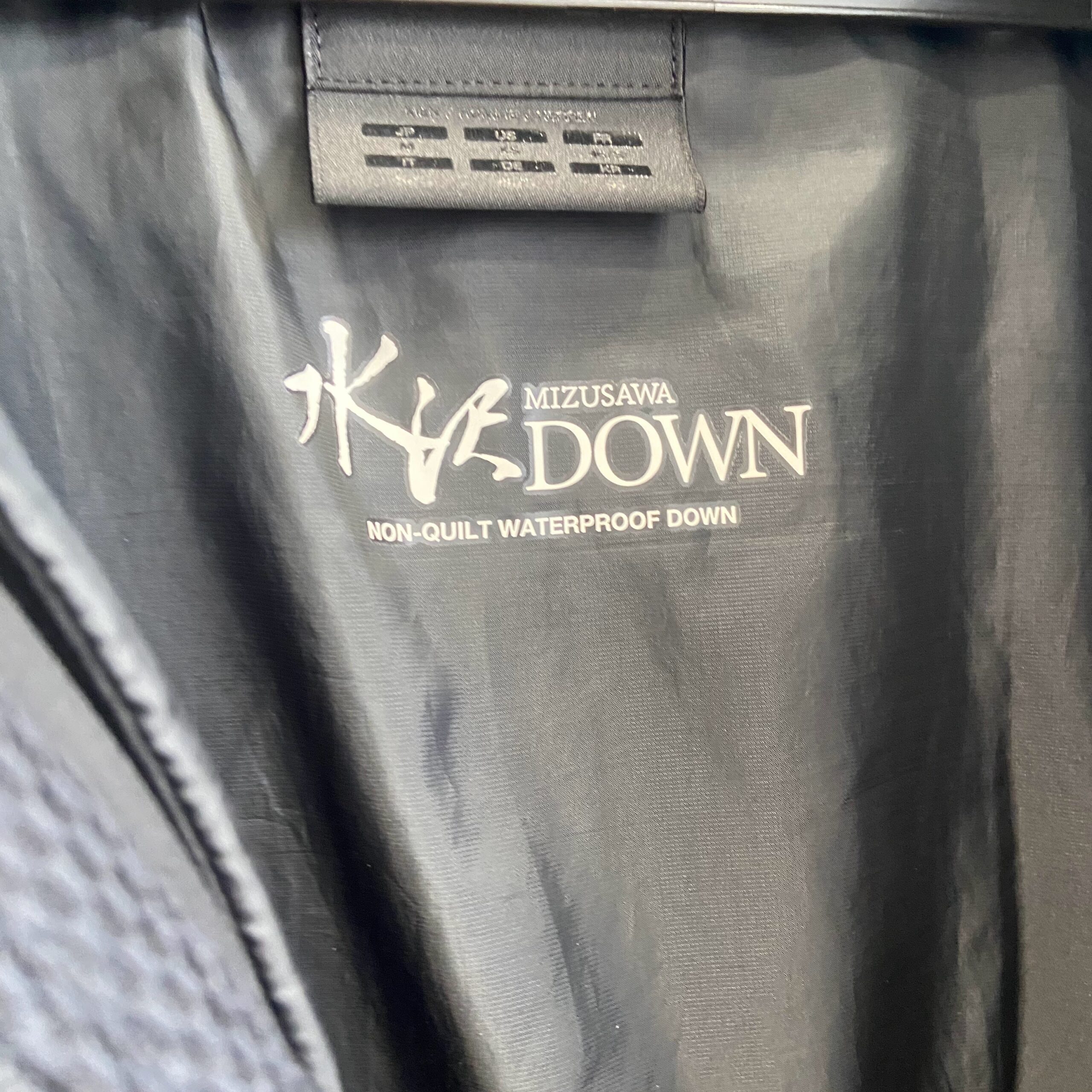こちらは水沢ダウンクリーニングをしているとかなりの確率でついてくる裏地についているシールプリントされた場所です。こちらはさすざシームレスで作られているためかこちらにもシールがボンディングされております。こちらはクリーニングしすぎるとプリントが剥がれてしまう恐れがありますため、慎重なクリーニングが重要になってきます。一度や二度では簡単に取れませんが、何度か続けると取れてしまう傾向にあります。そのため、水沢ダウンの場合は熱を加えずに水沢ダウンクリーニングすることがポイントです。プリントはボンディングされているのでいつかは剥がれてしまうのですが、そうならないように気をつけて洗うことがポイントとなってきます。液温は季節でも変わってきますので、調整しながらのクリーニングとなります。クリーニングすると全く剥がれなくはなく、剥がれる要因の一つです。しかし、物理的に負荷をかけないで水沢ダウンクリーニングすることは不可能ですので、そうならない工夫をしながらクリーニングいたします。当社ではそうならないための技術で行なっております。具体的には温度だったり、クリーニング方法だったりします。ほとんどの水沢ダウンは取れませんが、ごく稀に取れることがあります。