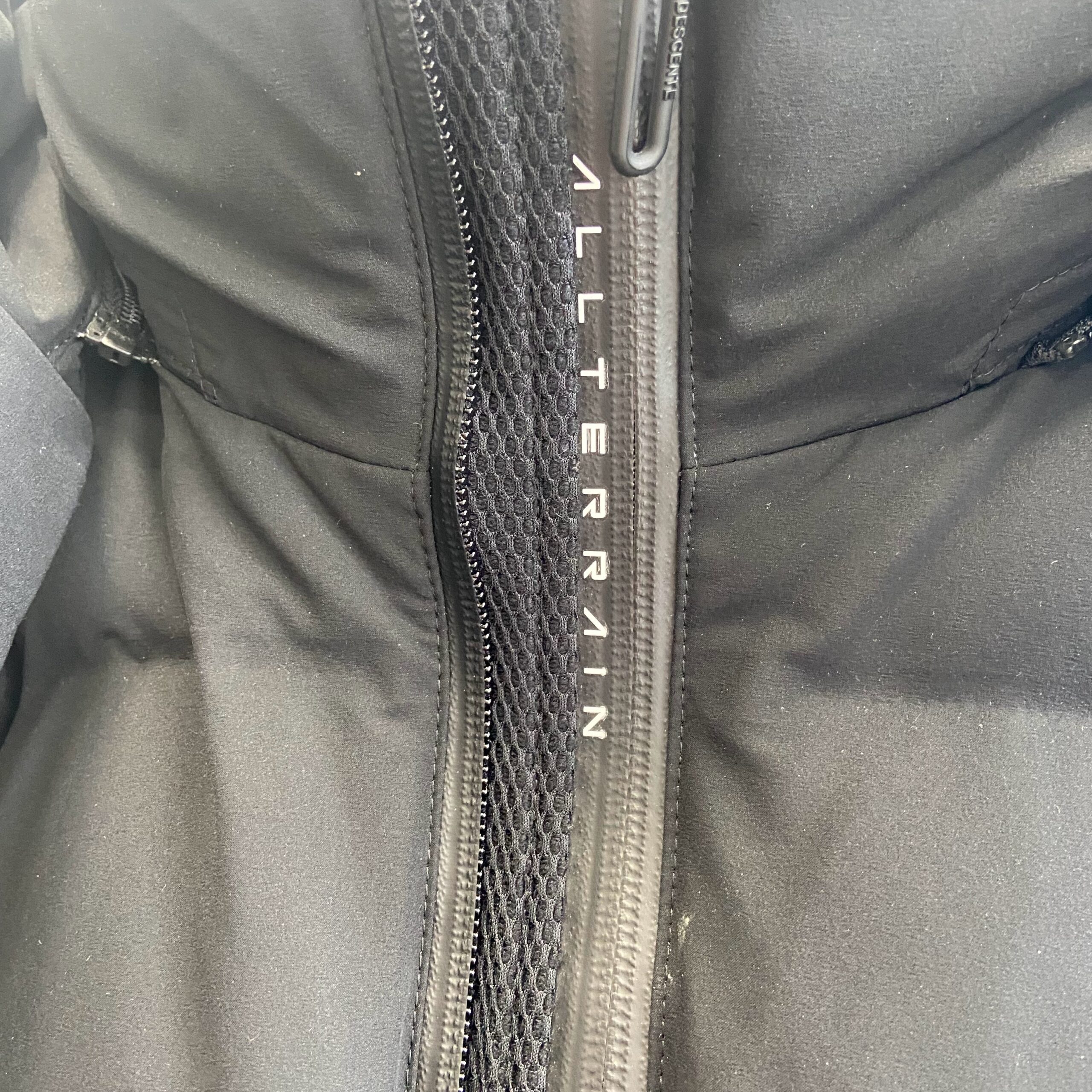 水沢ダウンのセンターのところにはこのようにアルファベットの文字と共に防水ファスナーが付いております。こちらは風除けと防水のために作られていると思われますが、とても素晴らしいと思います。真冬のためによく考えられた構造になっており、暖かさを徹底に追求した作りになっていると感じます。また、ファスナーが被らないように構造が備っており、作りにも徹底していると感じます。こう言った部分はPROSHOP HIRAISHIYAではなるべく負荷をかけないようにクリーニングすることを心がけております。案外強度がありそうに見えて、弱い部分が多く、優しくケアすることを心がけます。この部分は消耗の観点からも、使用する方の頻度により摩擦等で劣化することがあるからです。そのため、当社でも要注意部分として慎重に扱うようにしております。そのため、強く擦ったりしないように慎重に前処理を行います。基本的に汚れがあまりつかない部分なので、あまり触れないことが多いですが、それでも多少の汚れが見えたりしたら前処理して行いますが、今回のこちらの水沢ダウンは特に汚れもなく綺麗だったので、そのままの対応とさせていただきました。