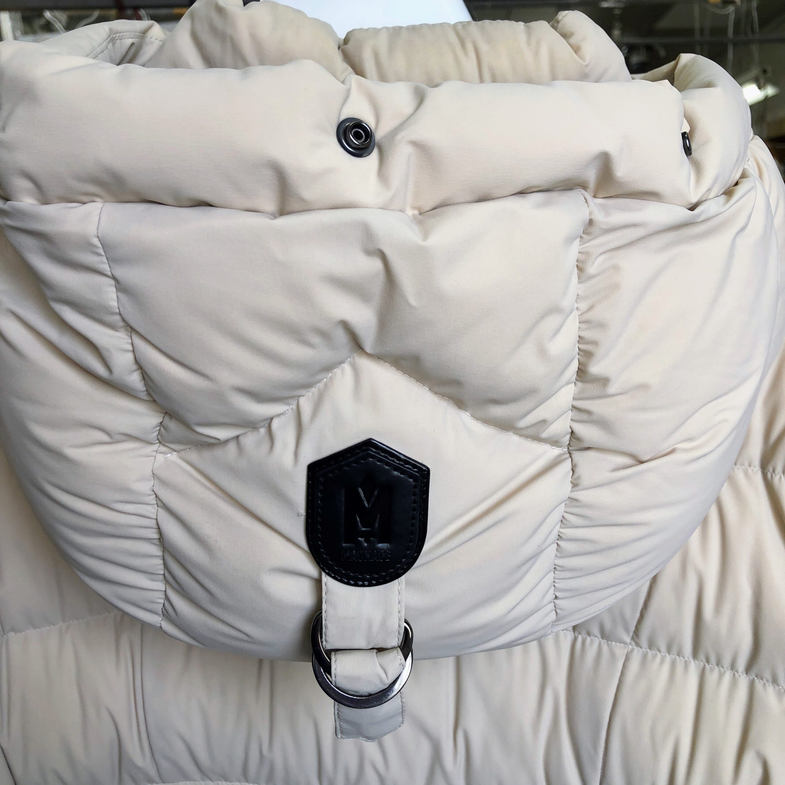今回お預かりしたダウンは、マッカージュの中でもブランドを代表するロングセラーのストレッチダウンコート「CALLA(カラー)」です。「美シルエット・華やかさ・防寒性」のすべてを兼ね備えており、大人の女性から圧倒的な支持を得ています。独自のストレッチ素材を使用し、体に吸い付くようなタイトなフィッティングとウエストシェイプが効いた曲線的なカッティングは、ダウン特有の着ぶくれ感を感じさせません。上品さと動きやすさを両立させた「着痩せを叶える美しいシルエット」が最大の特徴です。また今回はお預かりしていませんが、フード周りにあしらわれたボリュームのある高級ファーが顔回りを華やかに見せ、小顔効果をもたらします。ブランドの象徴であるレザーのトリミングも、都会的で洗練された印象を与えます。高い保温性を備えつつ、撥水性・透湿性・防風性のある素材を採用しているため、日本の厳しい寒さや急な天候の変化にも対応できる「高い機能性」も魅力です。ご依頼品のダウンもとてもラグジュアリーで魅力的なものでした。一見するとあまり汚れていないように見えますが、裾や袖口に黒ずみがあり、その他細かい汚れも見受けられました。