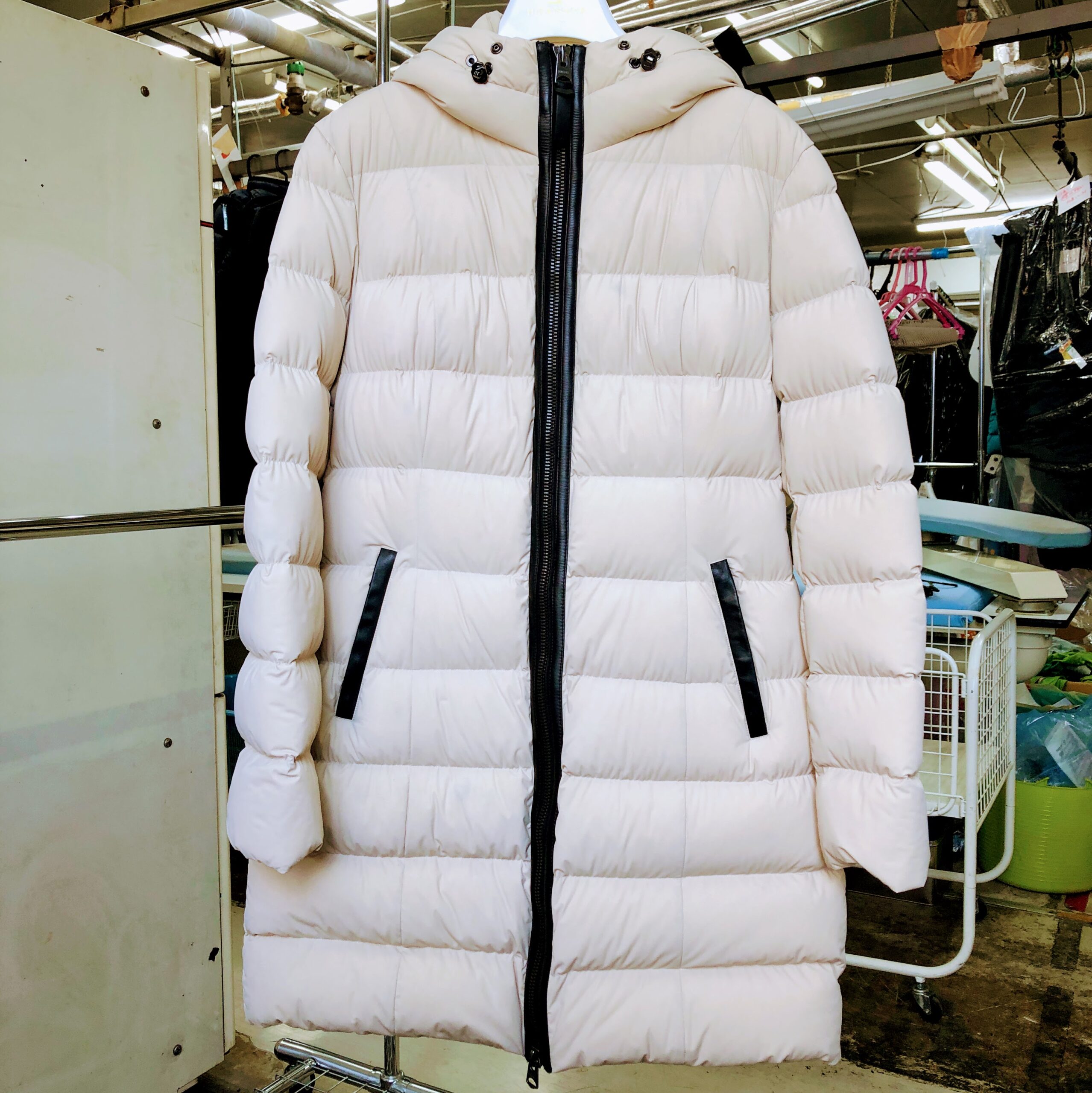 今回お預かりしたダウンは、マッカージュの中でもブランドを代表するロングセラーのストレッチダウンコート「CALLA(カラー)」です。「美シルエット・華やかさ・防寒性」のすべてを兼ね備えており、大人の女性から圧倒的な支持を得ています。独自のストレッチ素材を使用し、体に吸い付くようなタイトなフィッティングとウエストシェイプが効いた曲線的なカッティングは、ダウン特有の着ぶくれ感を感じさせません。上品さと動きやすさを両立させた「着痩せを叶える美しいシルエット」が最大の特徴です。また今回はお預かりしていませんが、フード周りにあしらわれたボリュームのある高級ファーが顔回りを華やかに見せ、小顔効果をもたらします。ブランドの象徴であるレザーのトリミングも、都会的で洗練された印象を与えます。高い保温性を備えつつ、撥水性・透湿性・防風性のある素材を採用しているため、日本の厳しい寒さや急な天候の変化にも対応できる「高い機能性」も魅力です。ご依頼品のダウンもとてもラグジュアリーで魅力的なものでした。一見するとあまり汚れていないように見えますが、裾や袖口に黒ずみがあり、その他細かい汚れも見受けられました。