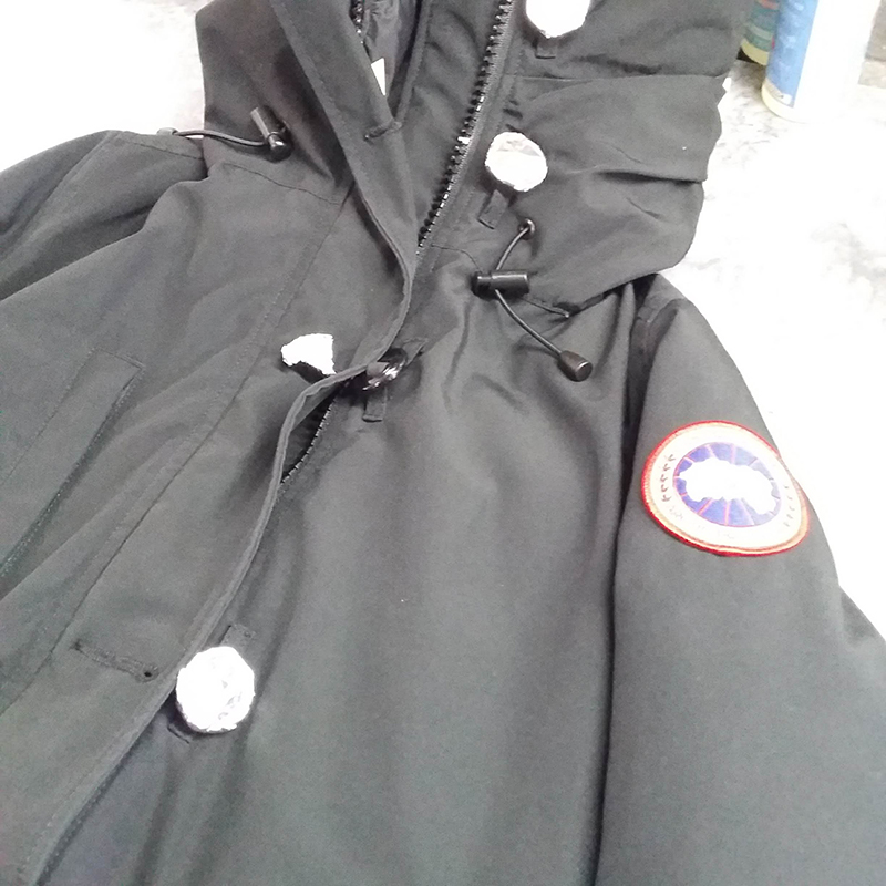 こちらはカナダグースのジャスパーという日本人用に作られた種類のダウンコートです。こちらはカナダグースの中でも大人気のものです。PROSHOP HIRAISHIYAでもこのカナダグースのジャスパーやシャトーなど数多くのものを受けております。これらはファーが取り外しできるようになっており、クリーニング屋さんにとってはとても助かる仕様になっております。これがたとえば、カナダグースに多い毛皮ファーが外せないものになると、とても大変なカナダグースクリーニングになり、料金も上がってきます。カナダグースクリーニングで最も多く、そして大変な作業になるのは本体もそうなのですが、実は毛皮ファーだったりするんですね。こちらはたまたまついていないですが、カナダグースクリーニングをしているとほぼ九割が毛皮ファーが付いてきます。これがついているとカナダグースクリーニングが二倍大変になります。当社も以前は毛皮ファーをお安く受けていたときもありましたが、とても大変なさぎょうのため、値上げせざる得なくなりました。それではこちらはついていないバージョンのカナダグースなので、そのお話を詳しく書いていきましょう。こちらは全体的にあまりよごれていないカナダグースでした。そうはいっても汚れは必ずといっていいほどどこかについていますので、処理をしないわけにはいきません。特にこのカナダグースクリーニングは黒なので、汚れがめだたない色になっており、たとえ見えなくても汚れはついていますので、そことの戦いになってきます。そのため、見えない汚れとどう向き合うかというのがこのカナダグースクリーニングのポイントになってきます。まして、カナダグースは黒が7割でその他もネイビーなどの濃い色が多いので、ほぼ汚れが見えにくい仕様になっていることが多いですね。それではこういったことを踏まえながらいきます。こちらのカナダグースクリーニングは全体的に汚れがめだっていませんが、まずは襟と袖を重点的に落としていき、カナダグースクリーニングのウェットクリーニングを行う方法で決めました。クリーニング方法も一点ずつ、どう洗うかを当社のクリーニング師がきめてから行います。汚れやカナダグースの状態、カナダグースの生地によってすべて変えています。これが機械ではできない人間ならではの技術になっていきます。こちらの素材はポリエステルが生地の半分以上をしめているので、生地的に強い部類に入ります。本来であれば、カナダグースメーカー指定であるドライクリーニングで行うのが一般的なのでうですが、当社ではそう行いません。通常はカナダグースメーカー指定のカナダグースクリーニングをドライクリーニングするのが一般的で安全でいいのです。それをなぜ行わないか?それはなぜだと思いますか!その原因は汚れの落ち具合とカナダグースの中に入っている羽毛の状態に関係してきます。正直言えば、PROSHOP HIRAISHIYAもカナダグースクリーニングをドライクリーニングしたいところです。まして、カナダグースクリーニングをドライクリーニングしたほうが楽なんです。ではなぜそこまでして行うかというのはまず、汚れ落ちの観点からいいますと、カナダグースクリーニングをドライクリーニングしても汚れがほとんど落ちないということです。具体的にいうと、カナダグースクリーニングのドライクリーニングは汚れ落ちが3だとするとカナダグースクリーニングのウェットクリーニングは汚れ落ちが12くらいです。約10倍の汚れ落ちの力があります。これは大きな差ですよね。カナダグースクリーニングのドライクリーニングは汗や血液、その他脂質がほぼ取れません。みなさんが通常近場のクリーニング店へカナダグースクリーニングを出す場合はこの洗い方をしています。これでいいという場合は何も問題がありませんが、長い目でみると生地にはかなり負荷がかかってきます。それは汗や脂質が蓄積されて変色や嫌な匂いを放ってくるんです。これはよくないと思いませんか?しかも日に日にそれが増してくるんです。汚れが落ちないで放置されると、汗や汚れが空気中の酸素と結びついて酸化という状態になってきます。こうなってしまうと、次のシーズンにカナダグースクリーニングを出そうとするころにはこの酸化の状態により、汚れが落ちなくなってしまいます。また、変色してしまい、せんしょくしないと直せなくなります。この可能性が日毎に増していくのがこの汚れが落ちないで放置する事になっています。これではまずいと思いませんか?まして、匂いも汗が中の羽毛や表面の生地に残っていて嫌な匂いを発したり、ダウンのボリュームが無くなってきます。これも中にはいっている羽毛に汚れがついて重くなっていき、ボリュームをなくすという仕組みになっています。こうなってからでは遅いのです。それが、カナダグースクリーニングをウェットクリーニングするとこれら