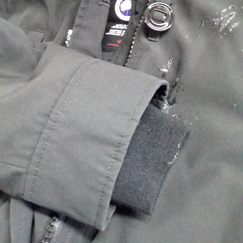 このように袖も襟についで汚れが付きやすいです。しかもこの部分は白化が特に起こりやすくなっています。こちらのカナダグースは白化があまりみられませんでしたが、通常のカナダグースの七割型は白化の症状がカナダグースクリーニングをする前から見えています。たまに、カナダグースクリーニングしたから白化がひどくなったという方やカナダグースクリーニングをすると白化はひどくなりませんか?という方がいらっしゃいますが、これは違います。断言しますが、カナダグースクリーニングをしても白化することはございません。少なくともPROSHOP HIRAISHIYAでは起こりえません。というのは、PROSHOP HIRAISHIYAのカナダグースクリーニングの仕方はウェットクリーニングなので、カナダグースが染められている技法が顔料の染料のため、水の洗い方(ウェットクリーニング)ではその顔料が落ちません。顔料は油性なので、水には強くそれで色が抜けるということはありません。逆にドライクリーニングをすると色が剥げてしまうことはあると思います。そういういみではPROSHOP HIRAISHIYAのカナダグースクリーニングの仕方は白化を防止するのにも役立っています。通常のカナダグースクリーニングをドライクリーニングするほうが白化は起こりやすくなっています。話はそれましたが、このように袖もしっかり手作業で落としてからカナダグースクリーニングのウェットクリーニングに入っていきます。それなので、袖の汚れ落ちもきれいに落ちます。また、カナダグースの白化直しもカナダグースクリーニングをウェットクリーニングしてから染に入るので、きれいに色が入るんですね。