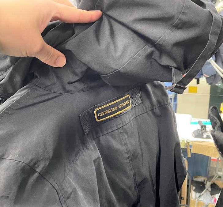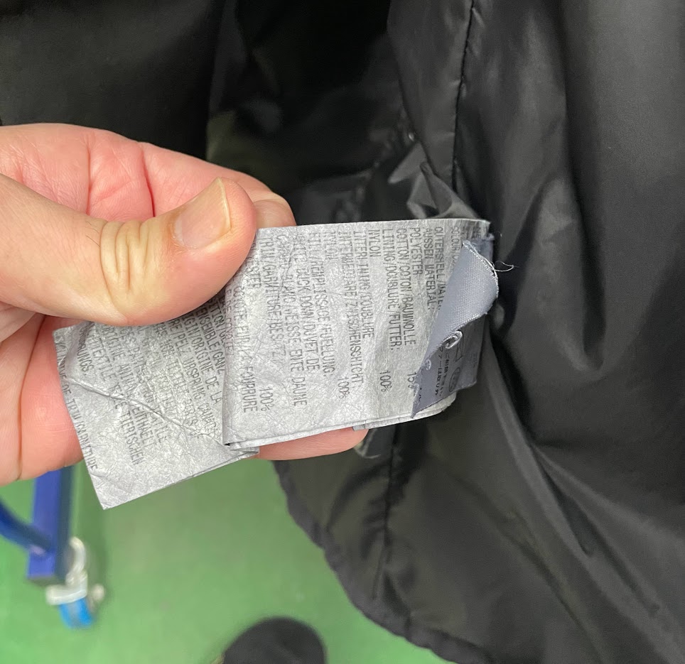 全体染め替え時は、漬け込み染色するため、ダウン衣類本体を始めとしてその他ワッペン・ブランドタグ・品質表示等がすべて一緒に染まってしまいます。そこで、本体以外を染めないようにするのがこのワッペン外しという工程です。