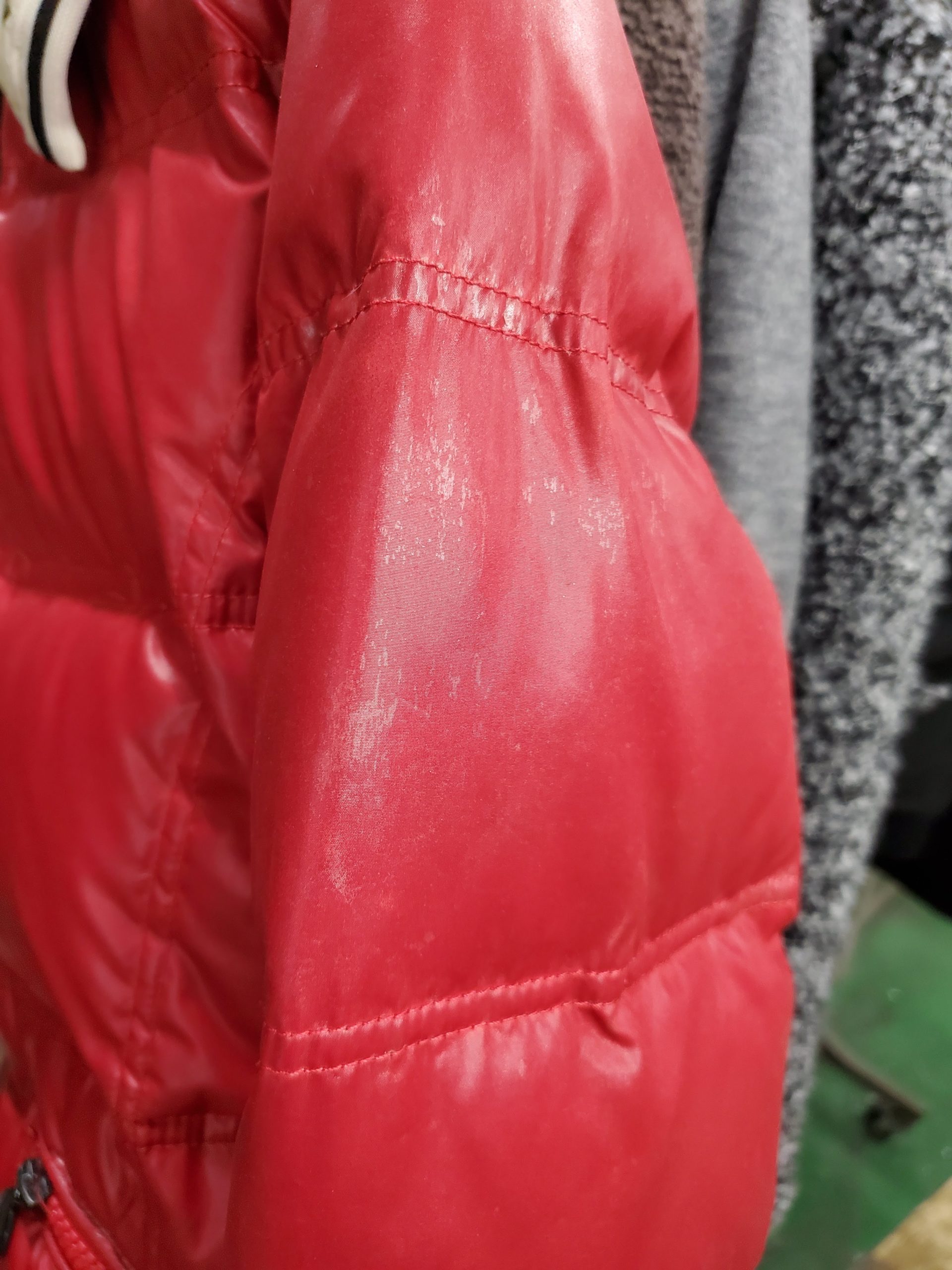 こちらはモンクレール製品ですが、相当古い物だと思われます。当社に来た時点で、少し剥がれておりましたが、クリーニングした後はさらにひどくなっておりました。こうなってしまうともうポリウレタンの劣化が進行してしまっているので、止めようがありません。当社では目立たないように極力ポリウレタン樹脂を剥がして、周りに対して浮かないようにして仕上げました。こういった症状になると言うことを知らないお客様ですと、お店とトラブルにナル可能性が高いんですね。なので、全国のクリーニング店で問題になっているのです。一点ずつお客様に説明できれば良いのですが、年間何万着と預かっていると、そうもいっていられませんので、PROSHOPHIRAISHIYAでは利用規約に記入させて頂いております。これを書かないとこの症状を知らないお客様とで何らかのトラブルになる可能性が高いです。これをご存じではないお客様にしてみれば、クリーニング屋さんでこうなってしまったのだろうと思いますよね。私も知らなければクレームを言うと思いますが、原因は実は寿命なんです。