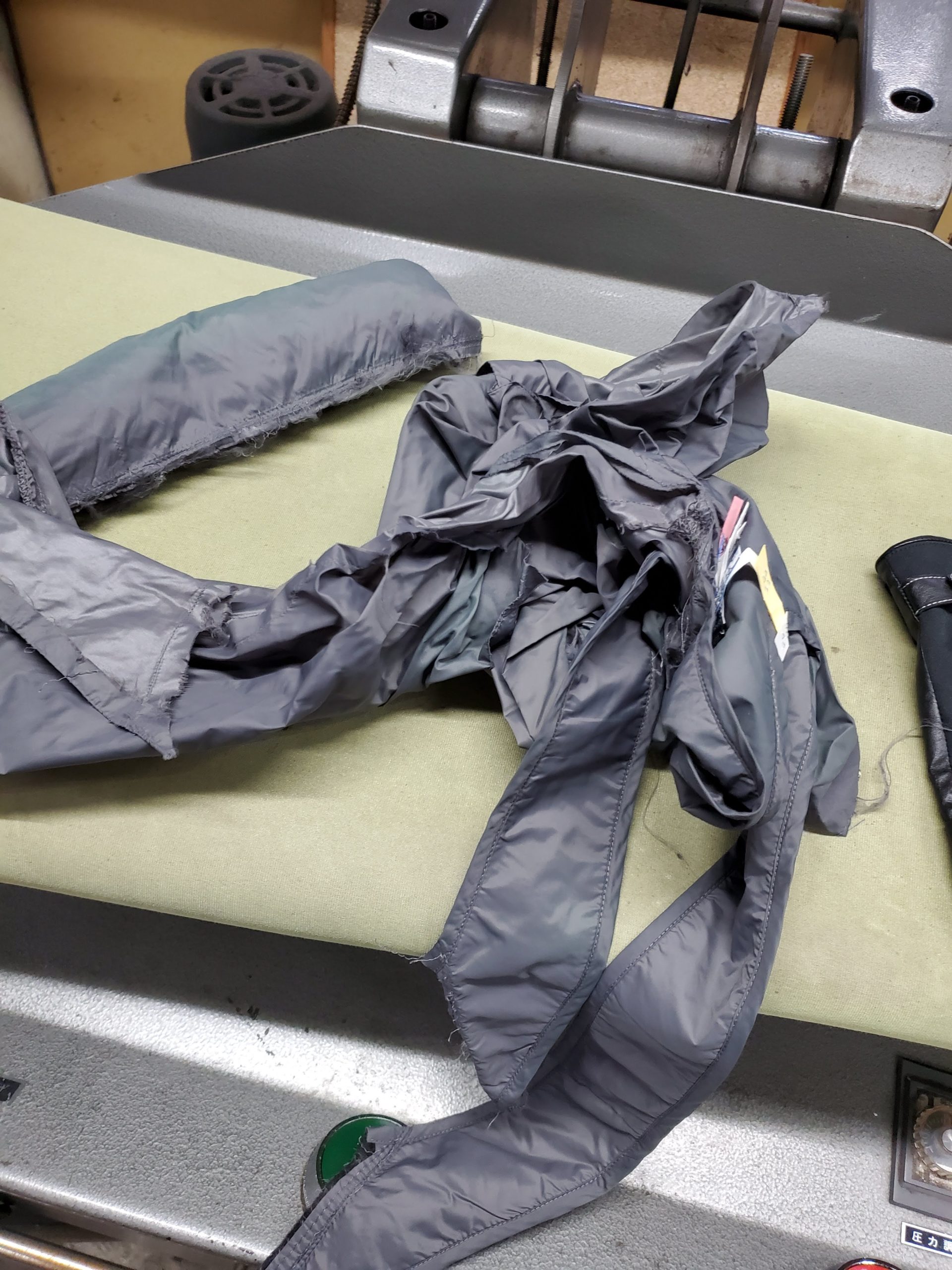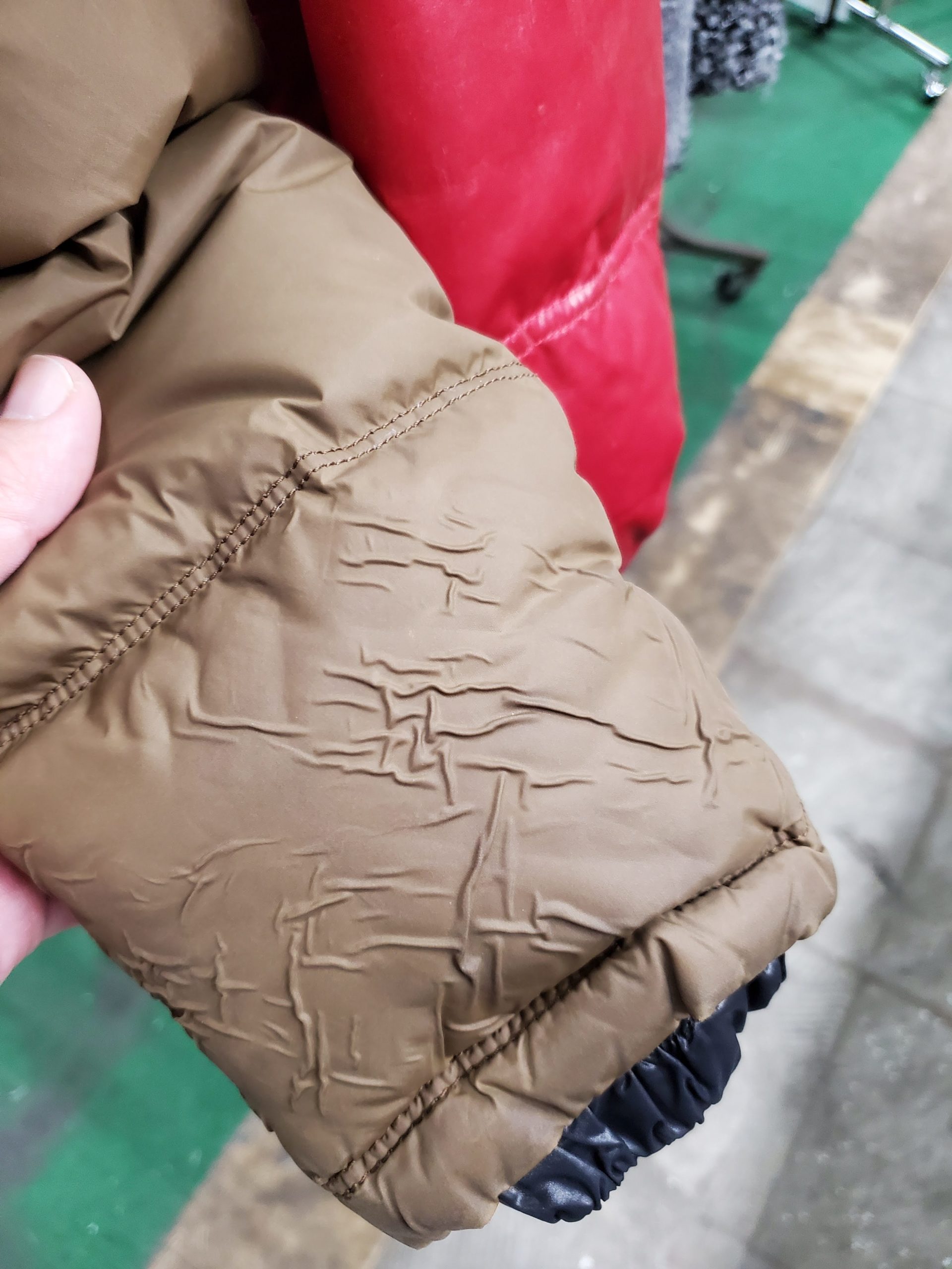 こちらは中に、空洞がはいってしまった高級ブランドダウンです。これも当社で実際に受けたものです。この状態の原因は、本来ならば売られている状態の時は、中の生地と表の生地がボンドでしっかり粘されていてこういった空洞がないキレイな状態でした。それが時間の経過と共に、中の粘していたボンドが劣化により繋ぐ役目が出来なくなり、表と中にずれが生じてきます。そして時間と共に中に空気が入りこのような状態になります。こうなってしまうと治しようがありません。これも中にポリウレタンが使われていると思われます。これは高級ブランドダウンに限らずボンディング加工といったジャケットやコートなどにも使われている手法です。なぜ、このような事をするのかというと、簡単に言うと、違う生地同士、いいとこ取りして粘していい衣類を作ろうとメーカーさんが作ります。例えば、綿であれば、汗を吸収しやすく肌になじみやすいという良い点があります。しかし、水分を吸収しやすいため、外で雨が降ったときに直ぐに濡れてびしょびしょになってしまうという欠点もあります。ナイロンは雨に強く濡れにくいという良い点がありますが、逆にいうと水分や汗を通さず、肌触りもあまりよくないという事があります。これらの二つの良いとこ取りをして裏地は綿で、表はナイロンで作ればお互い良いところだけを活かせるということで作られたのが、ボンディング加工された衣類というわけです。しかし、この加工も上記のように時間の経過と共に中の樹脂が剥がれてきてしまうという欠点があるわけです。なので、永久ではないです。