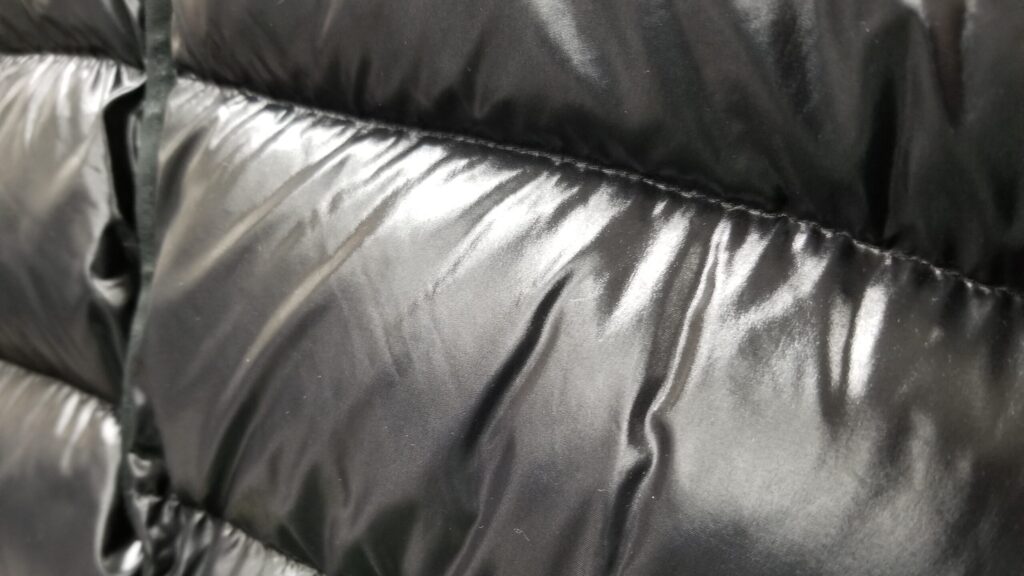 こちらもシリコーンの働きの一つである「ツヤが出る」という性能の働きです。クリーニング時に溶剤を入れますため、羽毛だけではなく生地そのものにも効果を与えることができます。特にナイロンやポリエステルのダウンにはツヤがあるものが多く、このツヤの有る無しで仕上がったときの見栄えに大きく影響を与えていると言ってもいいのではないでしょうか。