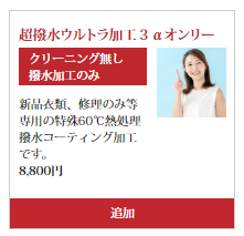 これまで、当オプションはクリーニングが必須となっていましたが、2023年にクリーニング無しでのご利用も可能となりました。「超撥水ウルトラ加工3αオンリー」という名称でオプションの選択を設けています。【クリーニング無し】と赤字で表記しておりますが、ご注文の際はお間違えの無いようご注意ください。クリーニングも併せてご希望の方は、「超撥水ウルトラ加工3α」をご選択の上ご注文ください。