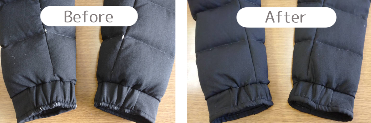 こちらは袖口が擦り切れてしまったダウンです。袖口は頻繁にものに触れ、摩擦が生じやすいので当社では似たような修理依頼が非常に多く寄せられます。修理方法としては擦り切れてしまった部分をさらに内側に縫い込むという形になります。画像をよく見比べてみるとAfter(右)の方が縫い込んだ分、若干短くなっていますね。別の生地をあてがったりするわけではないので、違和感のない仕上がりになります。