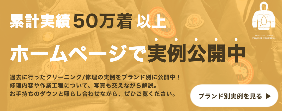 本日はダウンの劣化を判断するポイントと寿命について、ご紹介させていただきました。素材や着用状況によって劣化の進行には個体差がありますが、いずれも起きうるものになります。万が一これらの症状が出始めてしまっても、ご覧いただいた例のように修復可能な場合もございますので、ぜひ我々、高級ブランドダウンクリーニング専門店 PROSHOP HIRAISHIYAにご相談ください。