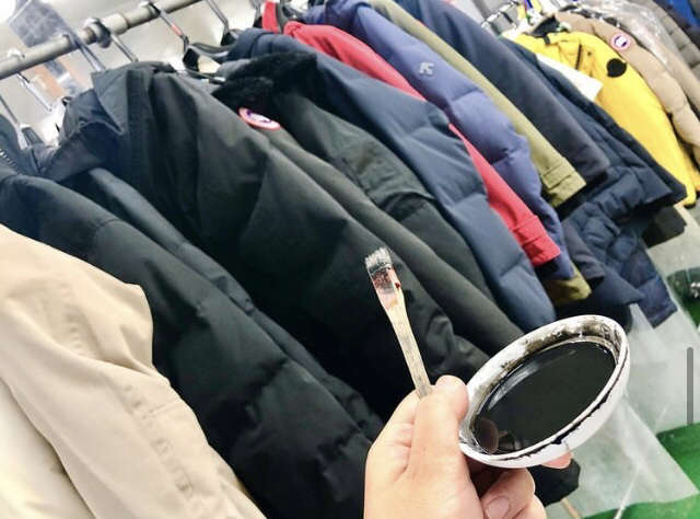 必ず起こってしまうものとはいえ、黒やネイビーなどの暗めなカラーは白化が目立つため、気になってしまいますよね。先述した通り、汚れではないのでクリーニングで直すことは不可能です。【部分染め】(白化した部分に、もともとの色と同じ色をのせていく作業)を行うことで、白化を目立たなくすることができます。これは、服に合わせて色を作成し、袖やポケットなど、白化した部分のみに染色を施していく作業になります。ほかにも、広範囲で白化が進んでしまっており、同時に色あせも気になる、という場合には【全体染め】(染料にダウン全体を漬け込む作業)を行うこともできます。白化してしまった面積に応じて、修理方法をご検討ください。