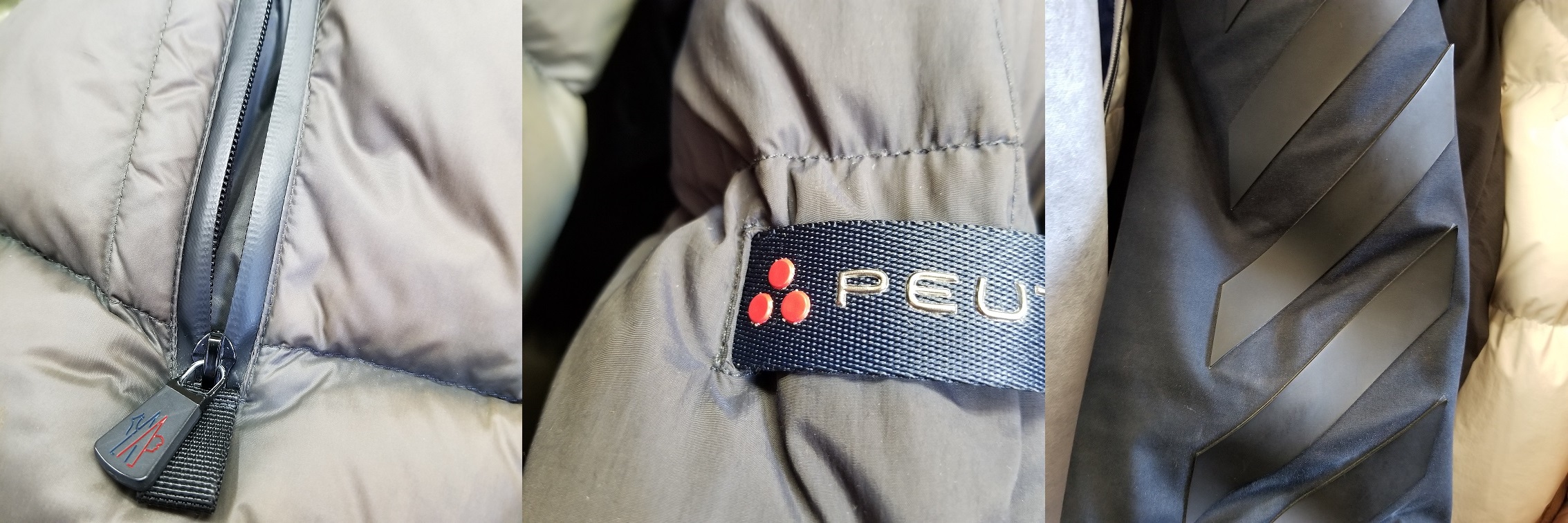 ダウンウェアに使用されているのは生地・革だけではございません。ロゴマークや文字、ファスナーカバー等にはゴムやシリコンのような素材が使用されていることもあります。