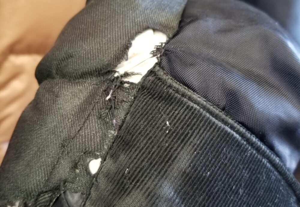 傷とは少し違うかもしれませんが、例えばカナダグースダウンに出やすい「白化」という症状は擦れが原因で起こります。擦れは生地の表面が擦れて劣化しつつある状態であり、ひどくなるとテカリも出始めます。このテカリが出た状態になってしまうと、部分染めでも全体染めでも色を入れることは難しくなります。テカリが出る前の状態であればある程度の色補修が可能です。